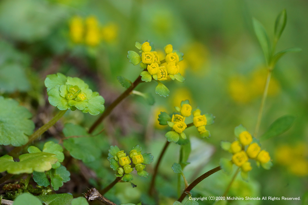 | 黄金猫の目草 以前に山を歩いていて出会った時の驚きを覚えている。 猫の目草に似合わず綺麗な色だったが、ほんの近所の谷にいっぱい咲いていることに気づいたのは10年ほど前のことだった。 毎年同じ場所で出会えることはうれしいことだ。 ユキノシタ科ネコノメソウ属。 3月、α7M3 + FE 90mm F2.8 Macro G OSS。  |