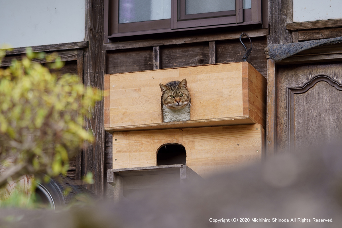 | 家主 村の猫。 立派な家を独り占めして、他の猫の侵入を許さない面構え。 そこでにらみをきかせたんじゃ、みんな遠慮するよな。 仲良く入れてあげればいいのに。 4月、α7M3 + FE 90mm F2.8 Macro G OSS。  |