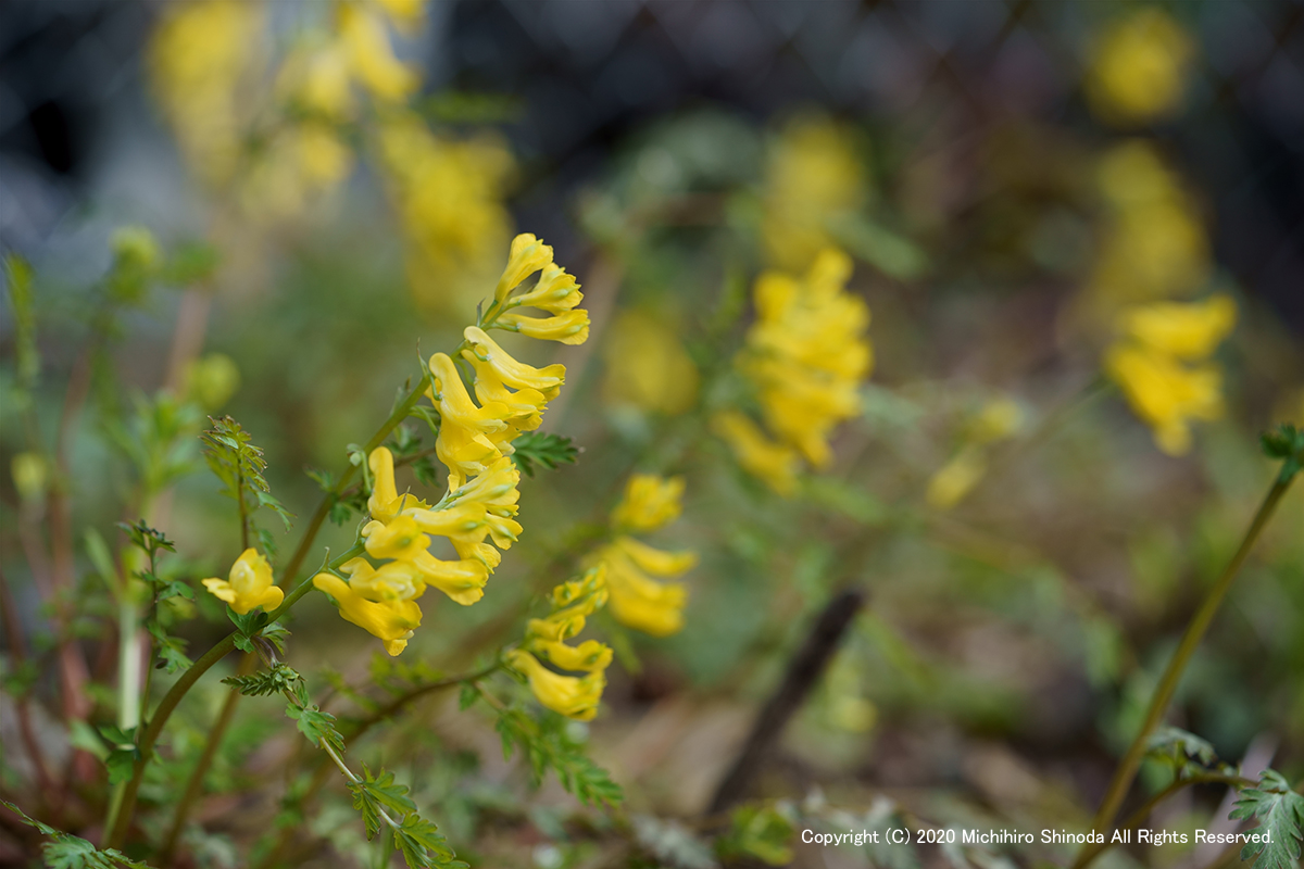 | 黄華鬘 崖を見下ろすと陽を受けて咲いていた。 例年はほとんど撮らない花だが、今年はよく撮った ケシ科キケマン属。 4月、α7M3 + FE 90mm F2.8 Macro G OSS。  |