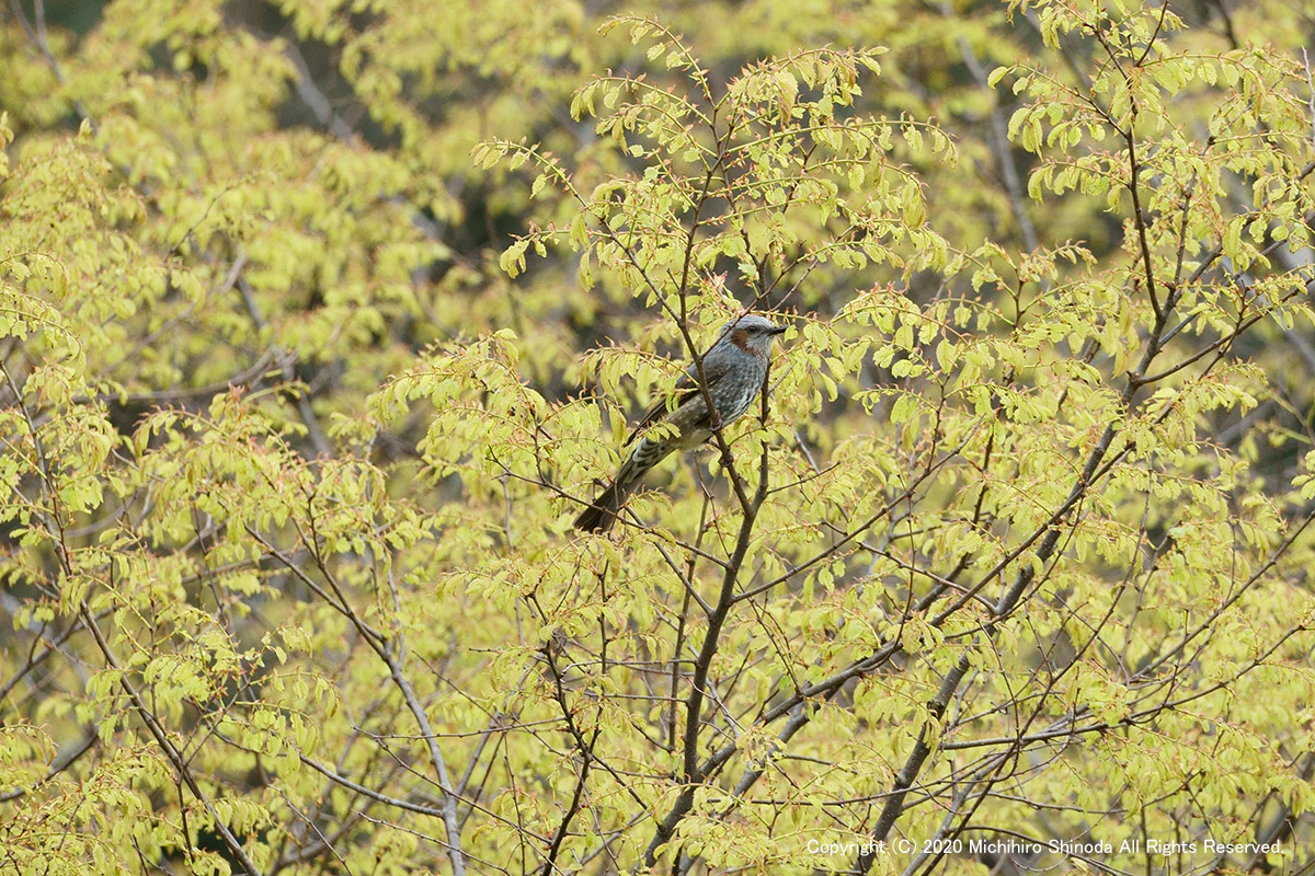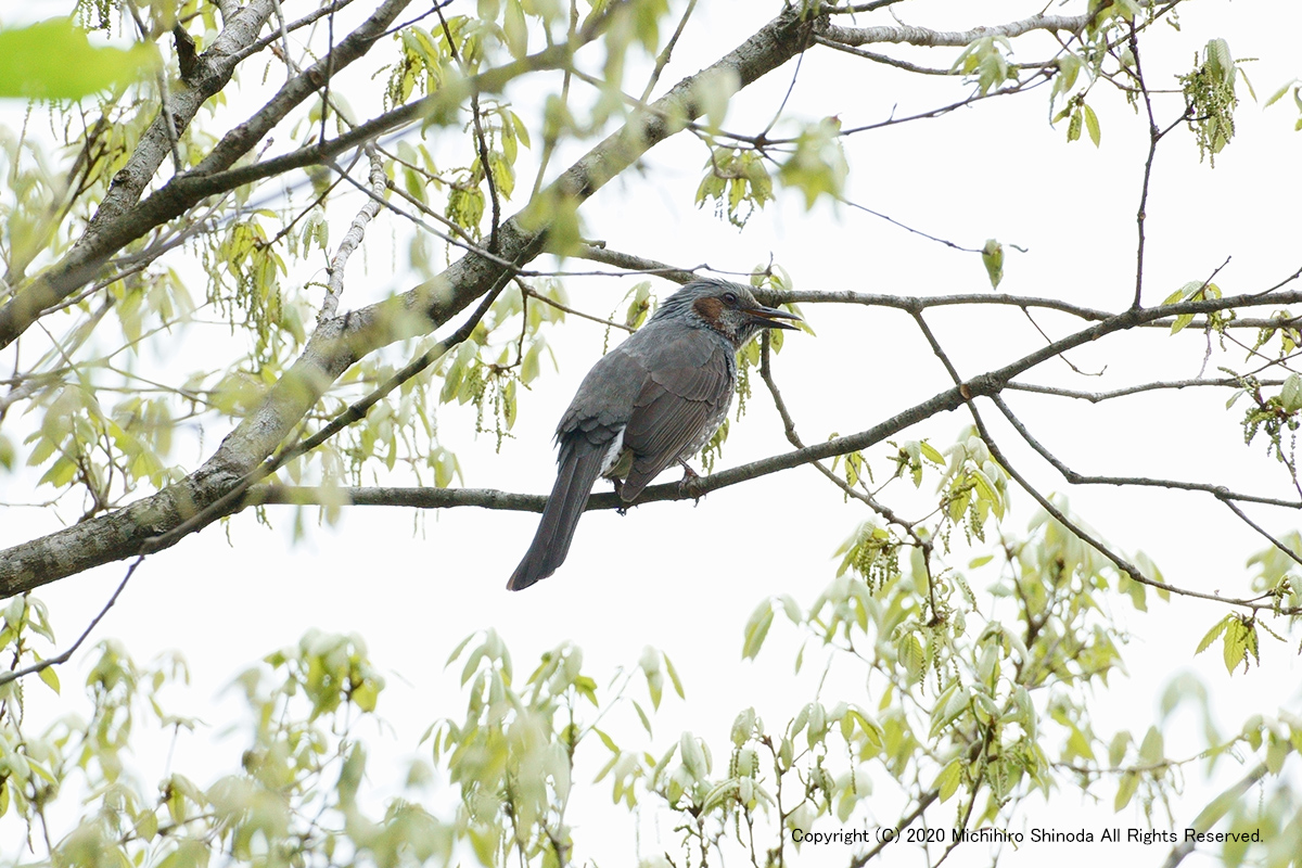 | 鵯1 けたたましい鳴き声に、目をこらすと鵯が新緑の中に顔を出していた。 4月、α7RM2 + E 70-350mm F4.5-6.3 G OSS。  |