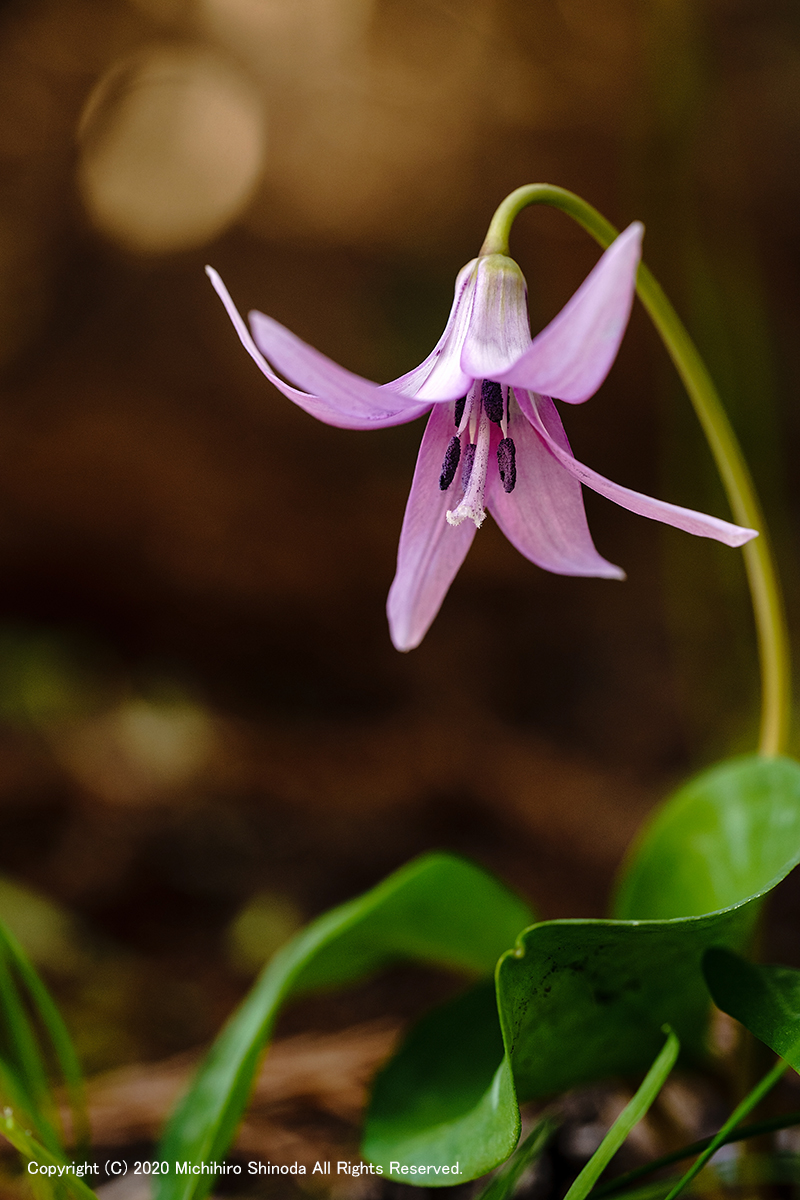 | 片栗 少し前にカタクリの葉があることに気づいた。 今年の開花はまだ無理かなと毎日立ち寄ると、つぼみをつけていた。 カタクリは種子から発芽、開花まで8年以上の長い年月がかかる。 スプリングエフェメラル(春の妖精)の代表で、葉が地上で見られるのはわずか2か月あまり。 4月、α7M3 + FE 90mm F2.8 Macro G OSS。  |