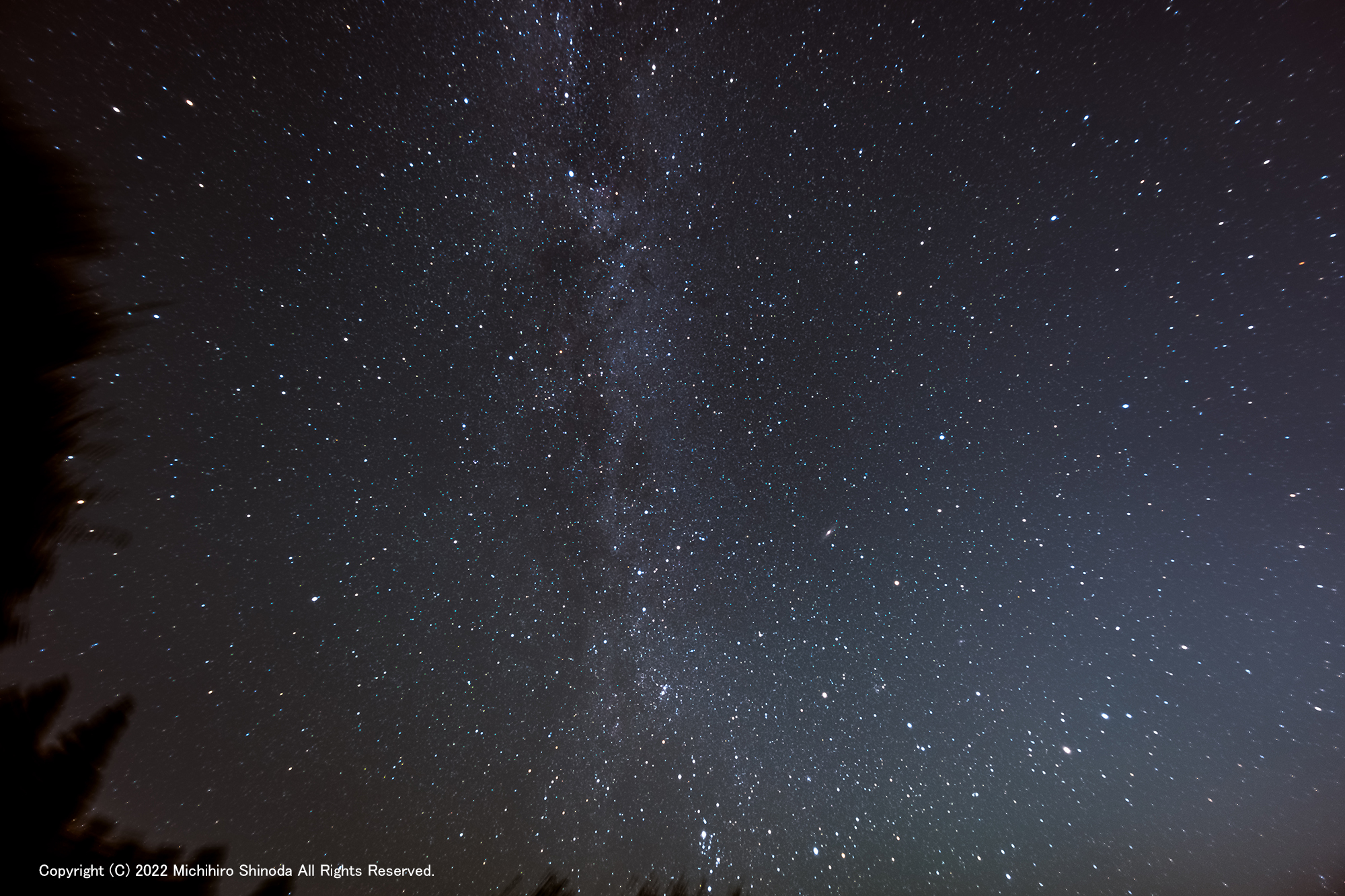 | 8月の終わりは夜が更けてくると秋の星空に出会える季節 画像の上には夏の星座を代表するはくちょう座の北十字がある。淡い秋の天の川を画面下にたどっていくと、カシオペヤ座に出会う。カシオペヤ座の右にはアンドロメダ銀河も顔を出している。カシオペヤ座のすぐ下にはペルセウス座の二重星団hχが見える 夏の空気が覆っているため、透明度は高くない。天候に恵まれなかったこの夏。初めての星空に出会えたと言ってもいいほど、久し振りだった。星を眺めるのに身体が慣れない。リハビリが必要なほどだ それでも星は周り、季節も移り変わっていく 14mm、ISO640、f2.0、60秒×19枚、マニュアルWB、Raw、角型フィルター(StarSoft)使用、後処理としてダークノイズ減算後加算平均コンポジット、赤道儀で恒星追尾撮影 2022年8月28日22時29分 揖斐谷 SONY α7M4 + FE 14mm F1.8 GM |
