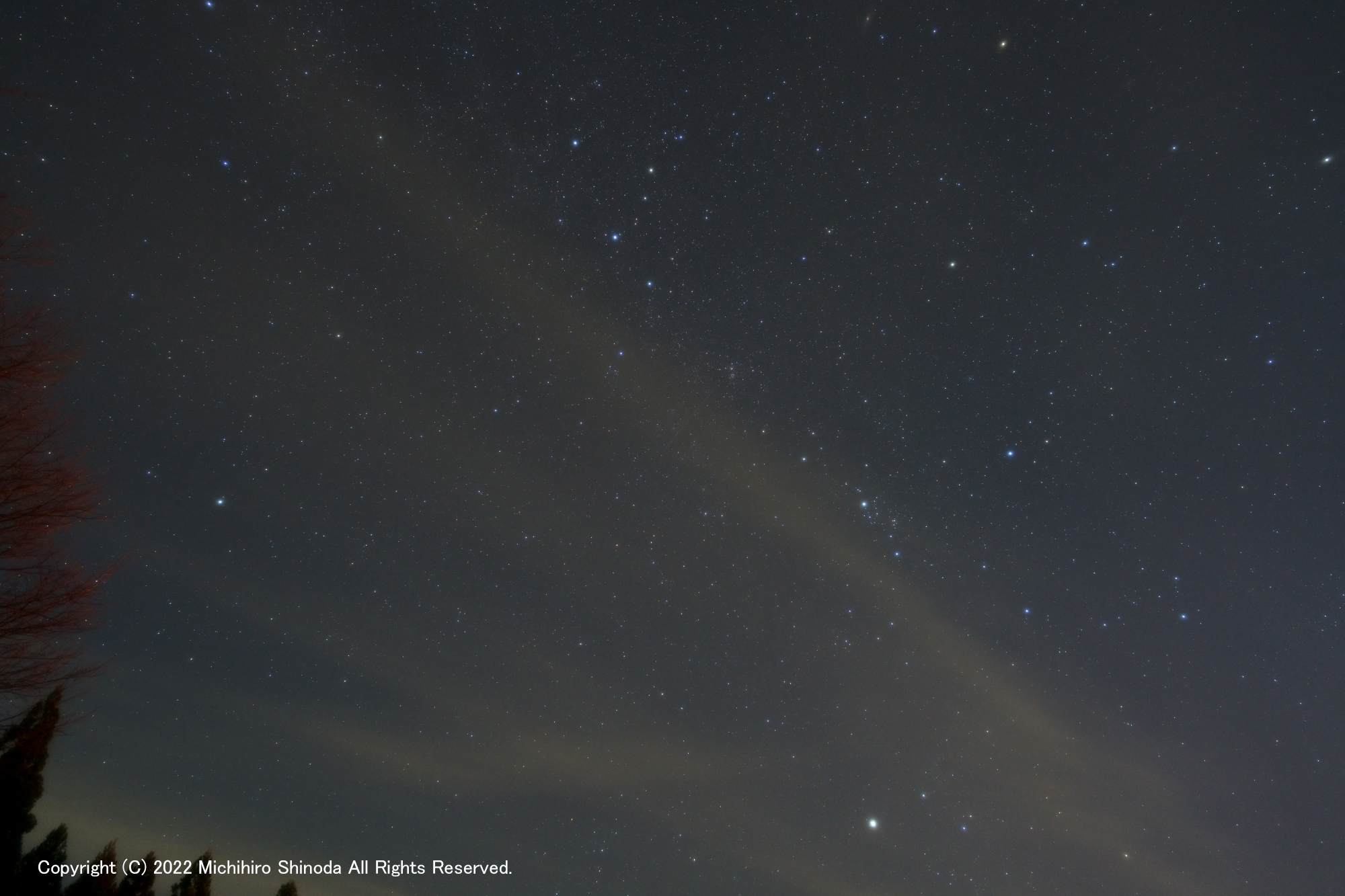 | ■ SONY α7RM5 を星空でテストする ■ 「星空を試写」というのもはばかられるほどの雲。こちらでは冬の前触れのような天候が続いていて、しばらく晴れは期待できなさそう。 うかうかしていると上弦の月はすぐそこまで迫っていて、満月までも視野に入ってきた。 次にいつ撮れるかわからないので、雲が迫る中で急いで撮ってみた。 今回使用した機材は今月25日に発売となったばかりのα7RM5 。組み合わせるレンズは FE 24mm F1.4 GM、赤道儀はビクセンAP。 FE 20mm F1.8 G と FE 18mm F1.8 GM も用意したが、四方から雲が押し寄せてきたので今回は出番を失った。 この夜の天文薄明は18時11分だが月齢3.2の月没は19時46分。上の画像の撮影時刻は18時24分、天文薄明は終わっている時間帯だが、近所のナトリウム照明が煌々と照らしている。撮影しながら光害が収まるまで待ったが、寄せる雲の速さに勝てなかった。 さてSONYのデジタル一眼カメラ α7RM5 で待望のRaw撮影時に高感度ノイズリダクションのon、offが選択できるようになった。「待望の」と言うには訳がある。私がSONYのα7RM2を使い始めた時、SONYのRawでは高感度NRがon・off選択ができないことに戸惑った。と同時に数多くの星空撮影をしながら、SONYカメラのRawデータのノイズの少なさに驚いた。 ただし等倍に拡大すると星空に輝く微光星が消えていることにも気づいた。つまりSONYのαのRawデータは常時ノイズリダクションが働いていてこれがノイズの少なさをもたらし、それとトレードオフの関係で微光星を消してしまうこともあるのではないか、と推測された。 一般の星景撮影においてはさほど問題にならないことだが、星空を余すところなく写そうとすると問題が生じる。例えば天体写真などだ。 惑星と違って恒星は究極の点光源と言っても過言ではない。 天体望遠鏡で星空を観望すると究極の点光源、すなわち無数の星がひしめいていることに驚く。もしRawで撮影した画像に常時高感度ノイズリダクション(NR)が働いているということになると、本来撮影できているはずの微光星が消されている、という可能性が出てくるからだ。 私は長秒時NRはoffで、32bitあるいは64bitで加算(または加算平均)処理することが多い。もし従来機がRawで撮影する段階で高感度NRが常時働いていたとしたら、そして撮影時にoffとすることができるならRawで消されていた微光星をそのまま写しとることができるのではないか、と期待が高まる。 テストでは原則としてRawは非圧縮14bitとし、クリエイティブルックはNT。コントラスト、彩度等は最低へ下げている。また高感度NRは切・弱・標準と順次変更しながら撮影した。圧縮Raw、非圧縮Rawの差異を検証するため、高感度NRの3段階とのクロスチェックを行った。同様に長秒時NRのon・offもクロスチェックの条件に加えたが、雲が押し寄せてきたため途中で断念せざるを得なかった。DROはoffにしたつもりが、どういうわけかオートになっている。次回に修正したい。 撮影後の検証段階で α7RM5 と SONY Imaging Edge の連携にバクがあることを発見した。撮影は赤道儀を恒星追尾動作された状態で長秒時NRのon・off、高感度NRの 切・弱・標準 を順次切り替えて撮影しているが、高感度NRの3段階の切り替えが Imaging Edge の Viewe にも Edit にも反映さずにすべて「切」になっている。しかし画像を検討すると高感度NRが働いていると思われるので、その情報が Imaging Edge にうまく伝わっていないようだ。この現象については SONY PRO サポート へ報告済み。 ------------------------ 上の画像のデータは次の通り。 ISO800、f2.0、15秒×1枚、非圧縮Raw、クリエイティブルックNT、コントラスト・彩度などは最低、マルミ・StarScape + ケンコー・PRO1D プロソフトン[A](W)使用 以下のテスト画像はフィルターは不使用。 |