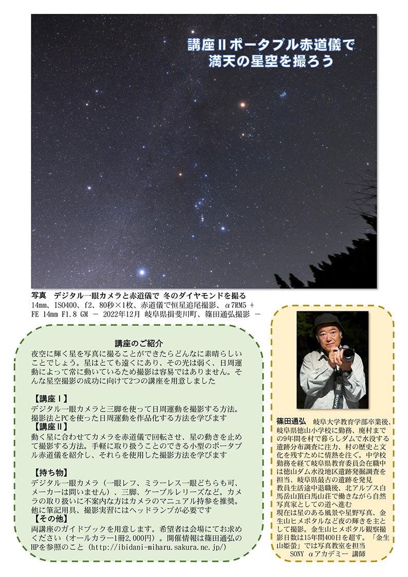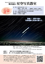| 皆さんは星が輝く心奪われる風景をご覧になったことがあるでしょうか。 どのような星のある風景に感動されましたか。 天の川をご自身の目で仰ぎ見て感動し、写真に残したいと思われた経験はあるでしょうか。 近年スマートフォンの性能は向上し、日中の明るいシーンではカメラを持ち出さなくても撮れないものはないように思われる昨今。しかし夜空の暗いところに輝く星空の撮影はハードルが高く、いろいろな困難が待ち受けています。 せっかく高いカメラを買ったのだからきっと綺麗に撮れるはず、、、、と思うのですが、なかなか思うように撮れないという経験をお持ちの方もあるのではないでしょうか。 一方、町には光が溢れすぎてどこを探しても星が見当たらないという日常があります。町明かりは光害(ひかりがい)とも呼ばれ、残念ながら年々星空に親しむことが困難になっていることもまた事実です。 あのとき見た星空の感動をカメラに収めたい。 そんな願いを叶えるには星空とカメラについての基本を身につけることが必要ですが、それらを楽しみながら一つ一つ学ぶことができれば、感動の星空撮影への道を歩み始めたことになります。 それは、実に、楽しい時間でもあります。 さて、暗い中での星空撮影でありがちな戸惑いは ・ オートフォーカスでピントが合わない ・ シャッターボタンを押してもシャッターが切れない ・ 撮れたと思ったら、真っ白や真っ黒になってしまった ・ ようやくシャッターかきれたと思ったら、カメラが止まってしまった などではないでしょうか。 現在のレンズ交換式カメラには、従来からある 一眼レフカメラ と新しい方式の ミラーレス一眼カメラ があります。コンパクトカメラやスマートフォンでは撮影が困難な星空ですが、これらデジタル一眼カメラを使用すると撮影することができます。 セミナーでは 一眼レフカメラ、ミラーレス一眼カメラ それぞれのカメラの仕組みと特徴を知るところから始めます。カメラと写真の基礎を学び、そこから星空撮影の基本へと学習を進めていきます。 また今回の「星空写真教室」のために、普段は夜間の立入が禁止されている金生山岩巣公園で撮影する特別な許可をいただいています。開催日は月の影響の心配もなく、晴れさえすれば、また大気の状態が良ければ、チラシ(表)に掲載したような星降る風景を撮るチャンスが生まれます。 そこで今回の星空写真教室の目標を次のように定めます。 心に残る感動の星空を写真に残すための知識と技術を身につける 写真の基礎から一つ一つ学んで、皆さんの写真ライフの充実を目指してがんばりましょう。 ご参加をお待ちしています。 (1/14掲載、1/15文面追加 星空写真教室 講師 Nature Photographer 篠田通弘) 【申込み方法】 チラシ掲載のQRコードを読み込むか、次のアドレスへメールで申し込んでください。 ibidamifujihashi●yahoo.co.jp ● を @ へ変更してメールアドレスとしてお申し込みください。 メールには (1)氏名 (2)住所 (3)電話番号(携帯番号) (4)参加希望講座(講座Ⅰ、講座Ⅱ、または 講座Ⅰ・Ⅱ両方 のいずれか) を記入してください。 ※ 複数名で参加を希望される方も一人ずつ申し込んでください。 マスクの着用は各自の判断でお願いします (2/20追記)。 受付は先着順です。 都合によりキャンセルされる場合は必ずご連絡ください。 |
