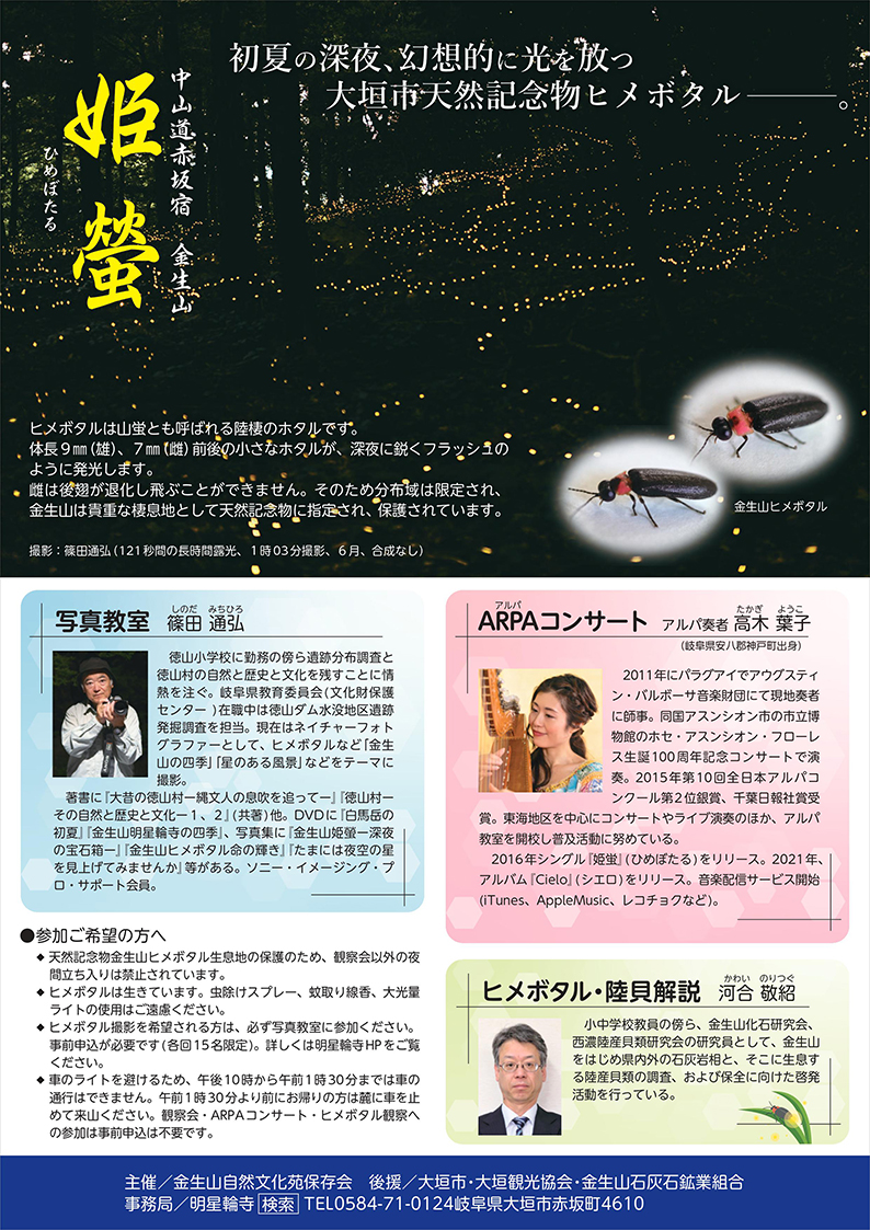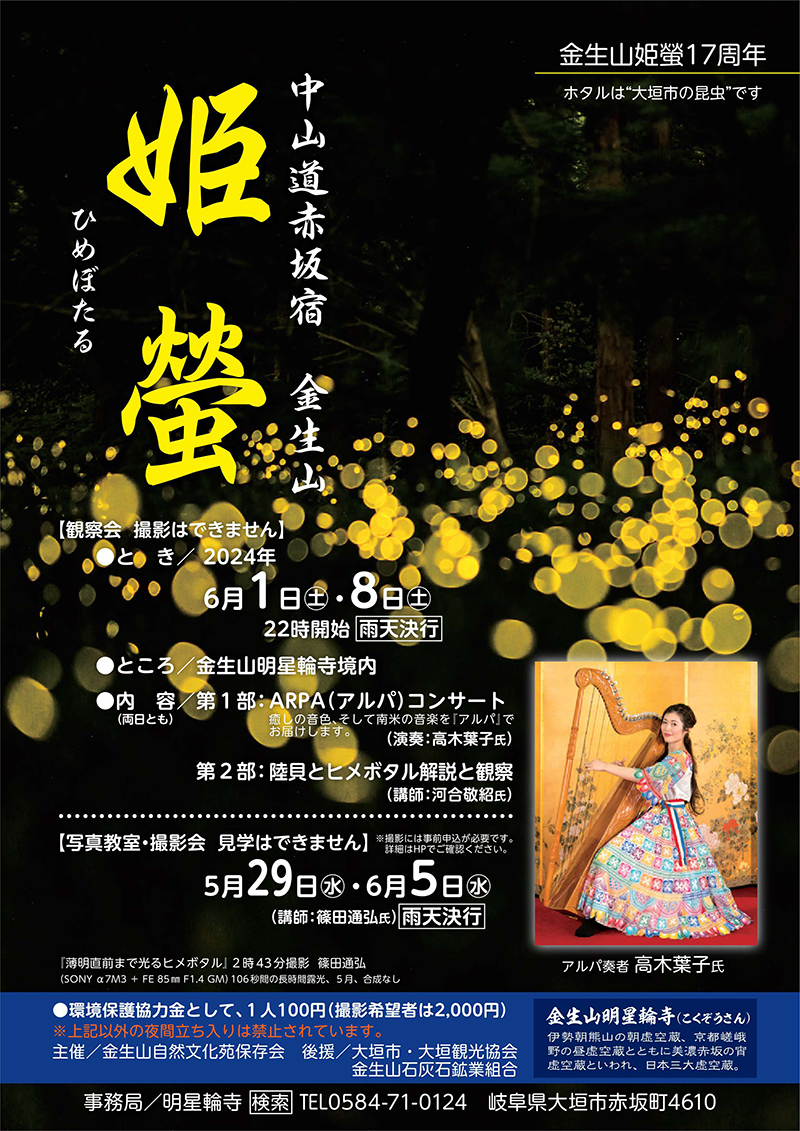 | 「金生山姫螢2024」は次の日程で開催します 5/29(水) 第1回写真教室・撮影会 6/1 (土) 第1回アルパコンサート・観察会 6/5 (水) 第2回写真教室・撮影会 6/8 (土) 第2回アルパコンサート・観察会 詳細は、仮案内をご覧下さい また写真教室・撮影会への参加を希望される方に向けて、Q&Aを公開しました。参考にして、ご検討ください 仮案内から変更のある場合は、HPにてお知らせします |