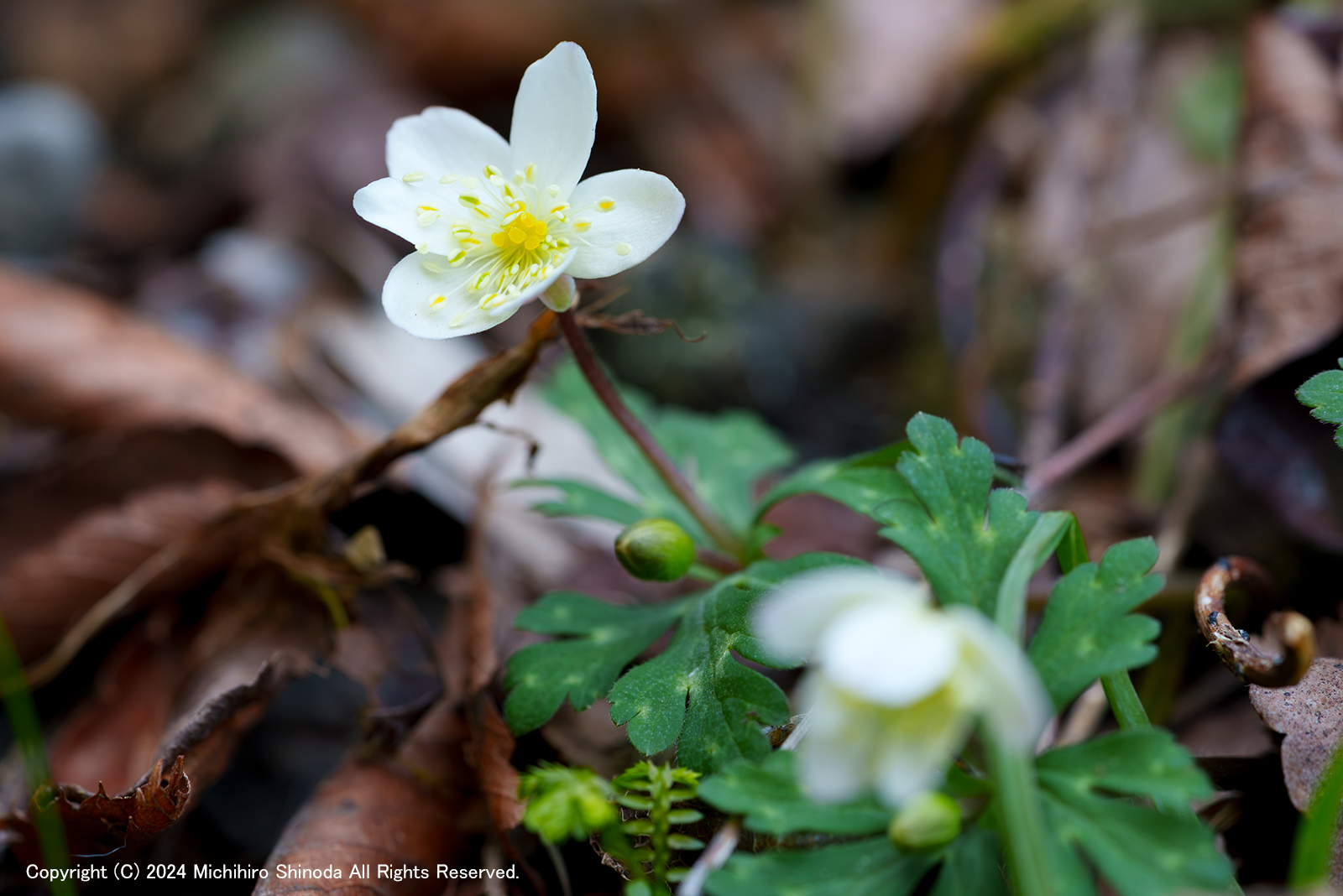 | ■ 二輪草(ニリンソウ) -揖斐谷- 膝折ればわれも優しや二輪草 草間時彦 季語は二輪草で、季節は晩春。しかし揖斐谷ではたしかに、早春のスプリング・エフェメラルに少し遅れて開花するかもしれないが、晩春というほど遅くもない 日当たりの関係だろうか、毎年真っ先に開花する場所が決まっている。今年も、いつもの場所で、いつものように花が見られた キンポウゲ科イチリンソウ属の多年草。山菜として食用になるというが、まだ食べたことはない。ちなみにイチリンソウは食用にはならない 花弁のように見える白い部分は萼片。上の個体は遅くに降った雪のおかげで開花が遅れたもの。そのおかげで萼片が傷むことなく姿を見せてくれた ※ α7RM5 + FE 90mm F2.8 Macro G OSS |