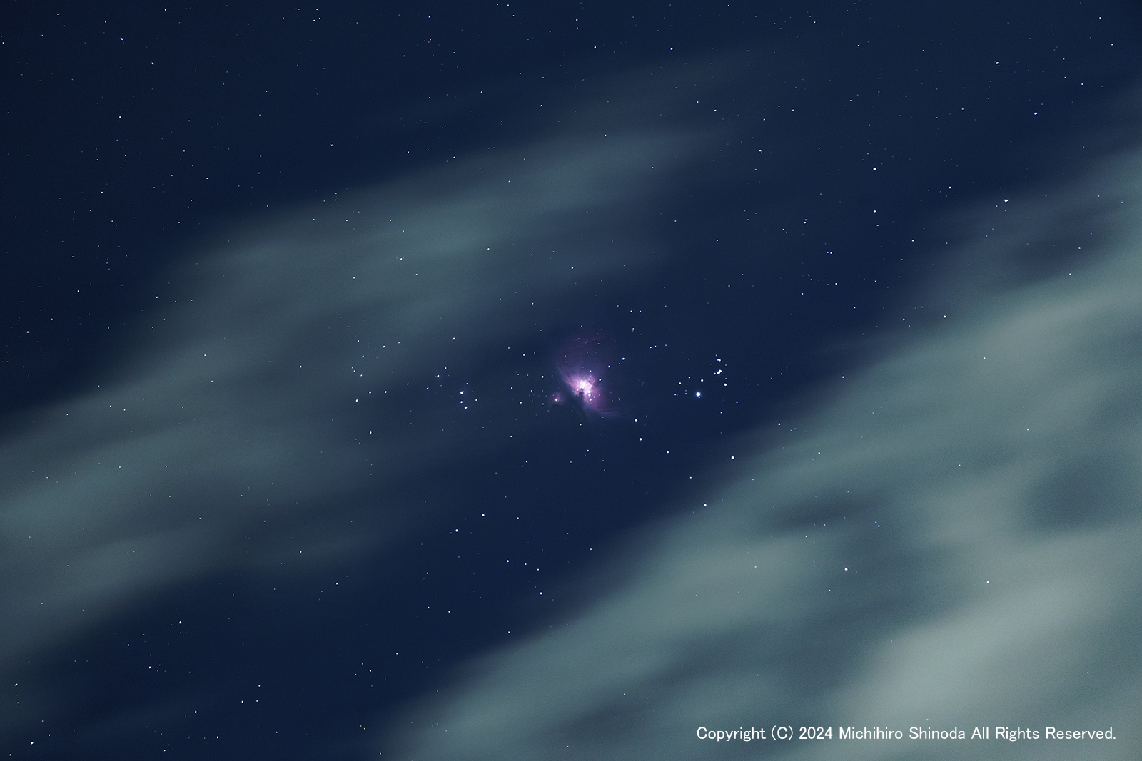| 流れる雲と M42 この秋初めての冬型の天候。あっという間に雲が覆い、雨が降り出した 傘を差して続行しようかと迷ったが、回復しそうもないのであっさりと撤収 2024年11月06日22時24分 |