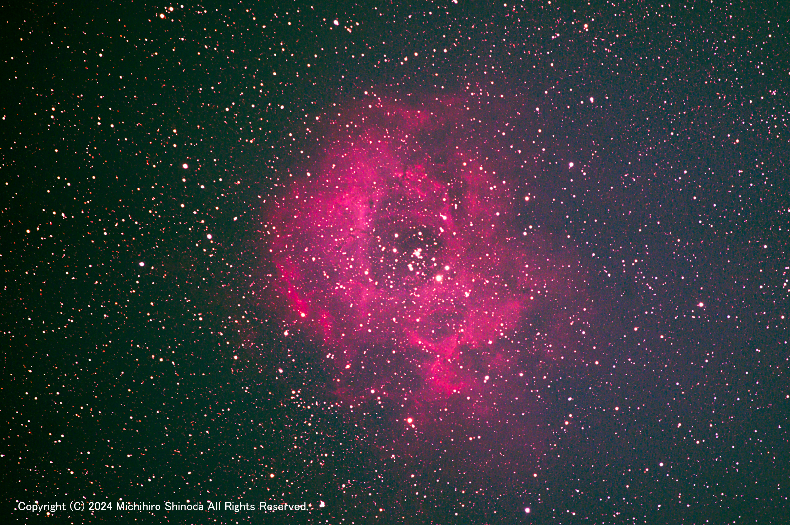 | 夜空に浮かぶロゼット -ばら星雲 を撮る- 冬のダイヤモンドを写した写真に微かに姿を見せていたばら星雲 いっかくじゅう座に位置する散光星雲。肉眼には感じにくいHα領域。赤色に近い色で、薔薇のロゼットのように見える 下の写真のように、天の川のまっただ中に位置するので、周りには星が溢れている オリオン座の1等星ベテルギウスと、こいぬ座の1等星プロキオンを結ぶ中点のややベテルギウス寄りを探すと見つかる といっても肉眼では識別は困難なので、撮影を繰り返して見つけることになる 街明かりの中で撮影 ---------------------------------------------------- 400mm、ISO3200、f5.6、1350秒(25秒×54枚)、ダーク減算後に加算コンポジット処理、マニュアルWB、Raw 高感度NRはoff、長秒時NRはoff、赤道儀で恒星追尾撮影、美濃平野部 SONY α7M3 (IR custom) + FE 100-400mm F4.5-5.6 GM OSS 2024年11月24日23時04分 |