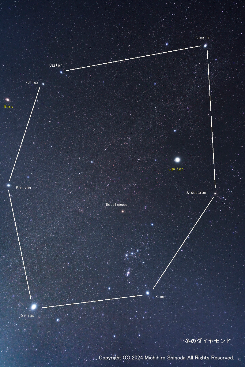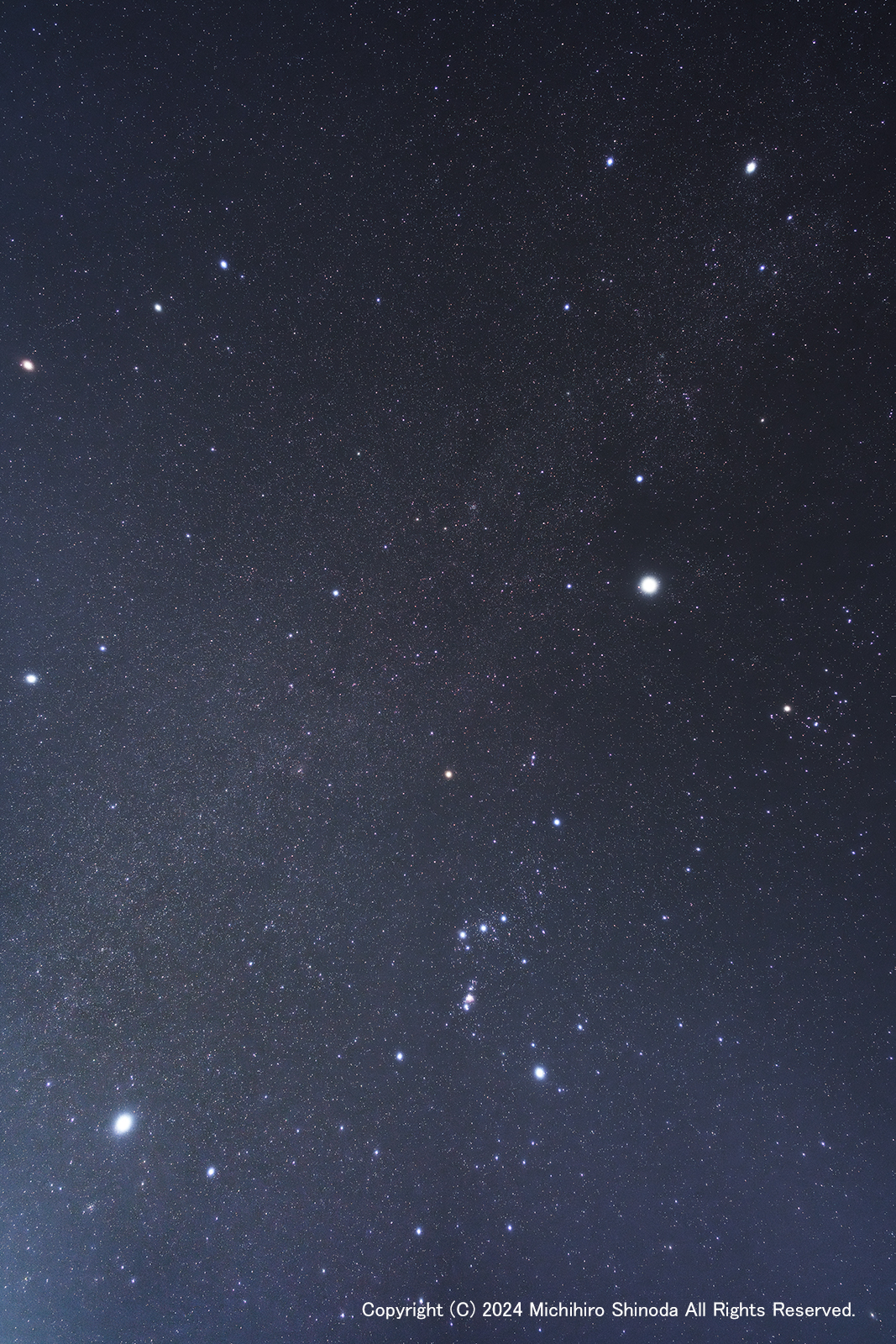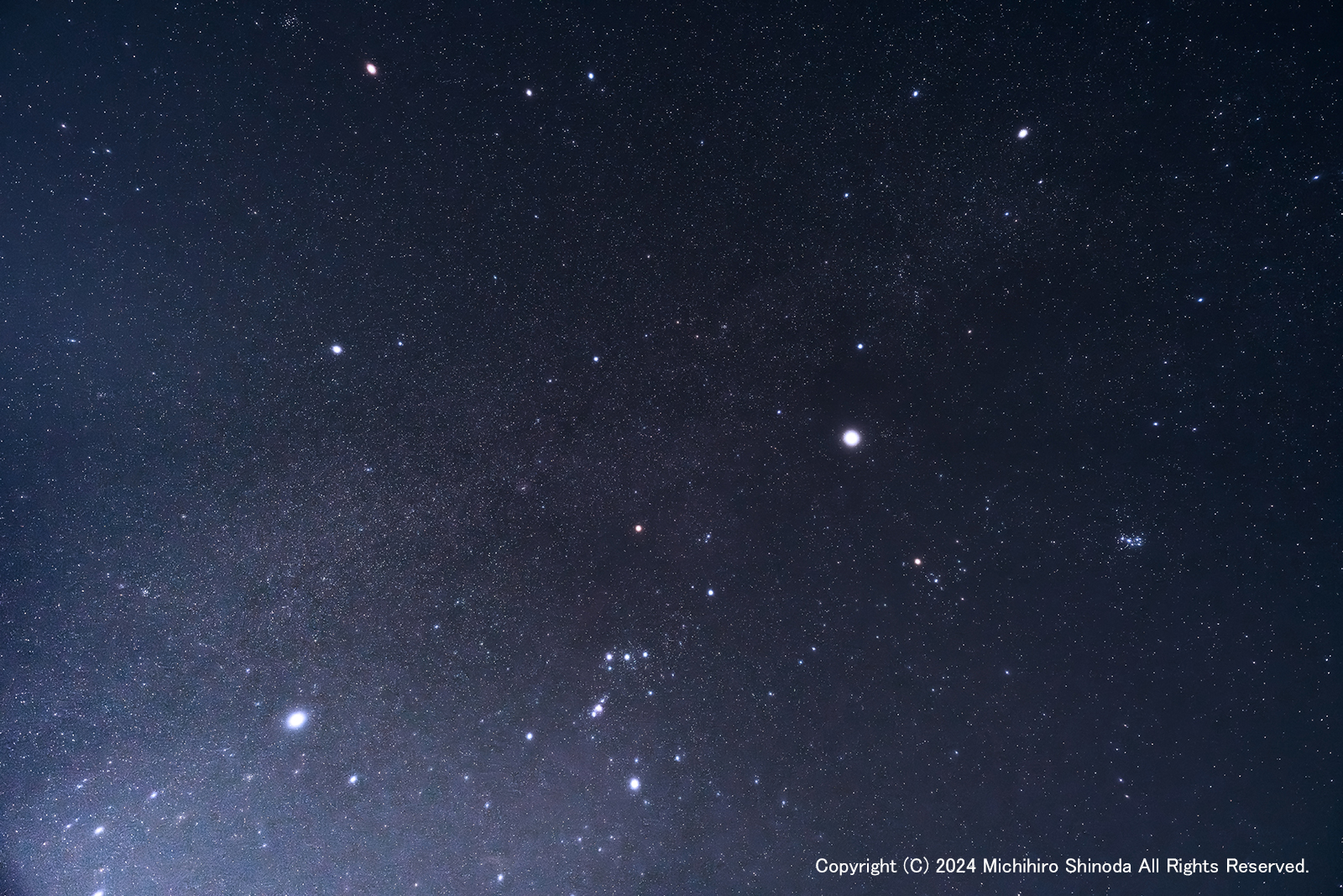 | 冬のダイヤモンドを撮る 予報は雨のち晴れ。それにしても大雨で、はたして晴れるのかと危ぶんだ 北寄りの強い風が吹く中、新月の夜に今秋一番の星空が広がった 日付が変わるとさすがに街明かりは収まり、冬の星座が天頂から西へと傾き始めた。この時間になると天頂の送電線は東にそれ、冬のダイヤモンドが姿を現した 24mmレンズを縦位置にセットして冬のダイヤモンドの全容を写した この秋は、惑星が冬の星座に侵入して何とも賑やかだ。まずオリオンの頭上、ぎょしゃ座と接するあたりではひときわ明るく木星が輝いている。木星は実に明るい。次にぎょしゃ座の左のふたご座のポルックスの近くには火星が赤く輝いている おおいぬ座のシリウス、こいぬ座のプロキオン、オリオン座のベテルギウスの冬の大三角の中を冬の天の川が流れている。夏の天の川のような派手さはないが、おちついた輝きを見せる冬の天の川のほとりには、かすかにばら星雲も姿を出している 肝心のおうし群は2つ流れたが、写野外だった ---------------------------------------------------- 24mm、ISO1250、f2、15秒、マニュアルWB、サイトロン スターエンハンサー、Raw 高感度NRはoff、長秒時NRはoff、赤道儀で恒星追尾撮影、美濃平野部 SONY α7RM5 + FE 24mm F1.4 GM 2024年11月02日26時27分 (時刻は30時間制) |