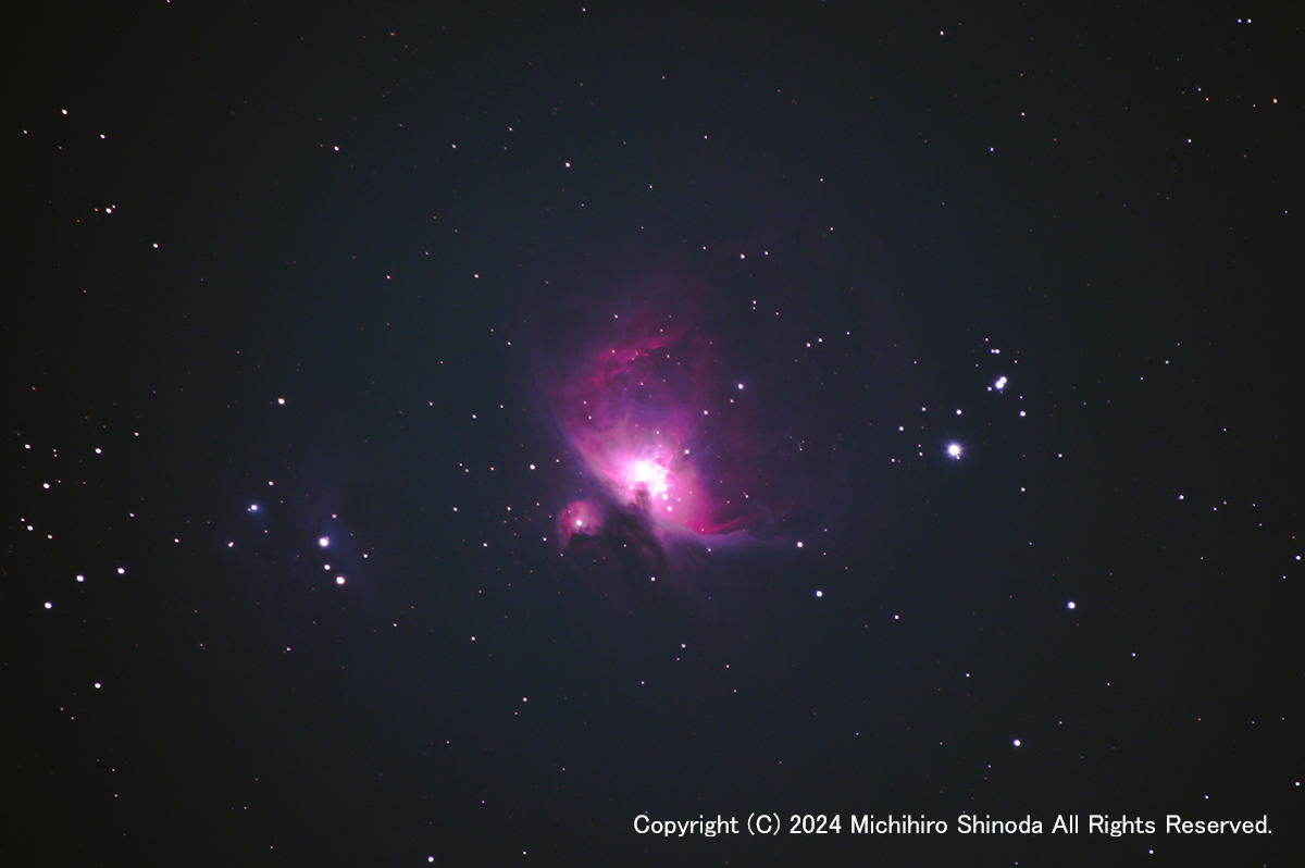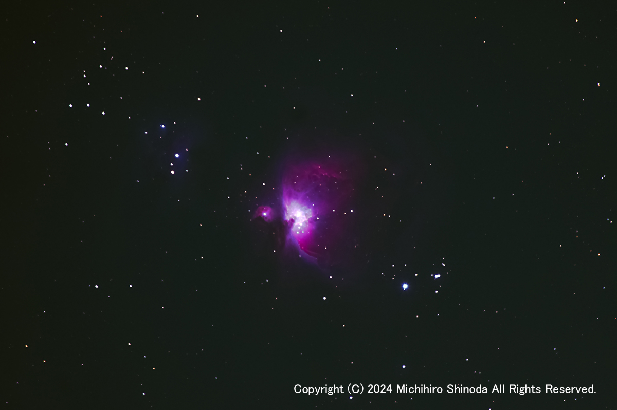 | オリオン大星雲 M42 光害があふれ、透明度のよくない街中。よどんだ東天にオリオン座が上ってきた 南中にはまだ早いが、南中まで待つとここでは送電鉄塔の送電線が邪魔をする。やむを得ず撮れるうちに撮ると決めて撮影を開始する。街中で、しかも高度が低いので、条件はよくない オリオンのベルトに相当する三つ星の下には、縦に並ぶ小三つ星がある。小三つ星の中央にあるのがオリオン大星雲M42と呼ばれる散光星雲で、ガスのかたまり。そこでは今もなお恒星が誕生し続けている。M42の中心には四重星のトラペジウムがある 肉眼ではわかりにくいが、M42はトラペジウムなどの星の紫外線によって水素ガスが電離して光っている。電離水素領域(HII領域)の発する光の波長は656.3nmで肉眼では赤色に近く見える おうし座流星群を待ちながらついでにM42を撮ったものの、望遠ズームレンズでの撮影は天体望遠鏡とは違って、なかなか厳しい 皮肉なもので、M42の撮影中に天頂から南へ明るい流星が流れた。ゆっくりと流れる流星はまさしくおうし群だった ---------------------------------------------------- 400mm、ISO3200、f5.6、455秒(15秒×15枚、10秒×15枚、5秒×16枚)、ダーク減算後に加算コンポジット処理、マニュアルWB、Raw 高感度NRはoff、長秒時NRはoff、赤道儀で恒星追尾撮影、美濃平野部 SONY α7M3 (IR custom) + FE 100-400mm F4.5-5.6 GM OSS 2024年11月03日23時17分 |
