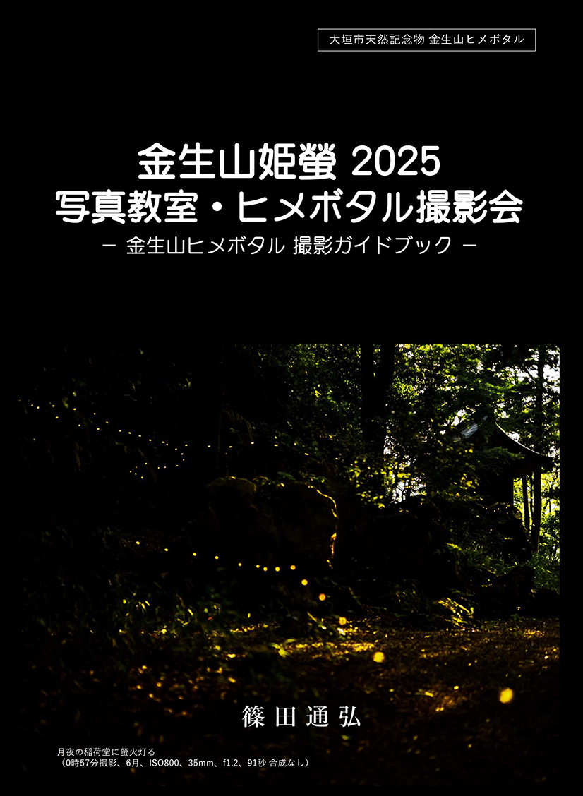 | 『金生山姫螢 2025』写真教室・撮影会 の ガイドブック A4判、オールカラー、オンデマンド印刷、70ページ、無線綴じ 30部:限定 (写真教室へ参加される方だけに差し上げる、プレミア・ガイドブックです。篠田の自費制作。) |