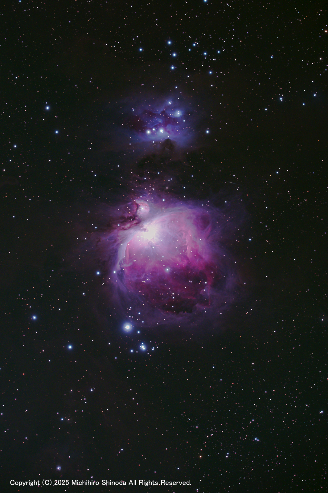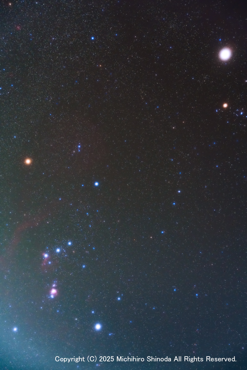 | 夜空の明るさ調査への報告用データを無事に取得。ほっとしてまだ街明かりに照らされた夜空を見上げる 冬型の天候に悩まされることの多い冬の調査は、毎回一喜一憂する オリオン座がほぼ南中しようとしていた 寒さに耐えかねて、あと2時間半が我慢できずこの夜の撮影継続を諦める。オリオン座とヒアデス星団近くに侵入した木星を撮る まだ早い時間帯だが、意外と星空のシーイングはいい。夕方まで強風が吹き荒れていたが、この時間にはそれも収まったことが幸いとなった オリオンの頭上ベテルギウスの右上には微かにエンゼルフィッシュ星雲が、オリオンの中にはバーナードループも見える オリオン大星雲M42が赤い光を放っている ---------------------------------------------------- 50mm、ISO1600、f2.8、30秒、マニュアルWB、Raw 高感度NRはoff、長秒時NRはon、赤道儀で恒星追尾撮影、揖斐谷 SONY α7M3 (IR custom) + TAMRON 28-75mm F2.8 Di III VXD G2 (Model A063) 2025年01月21日20時11分 |