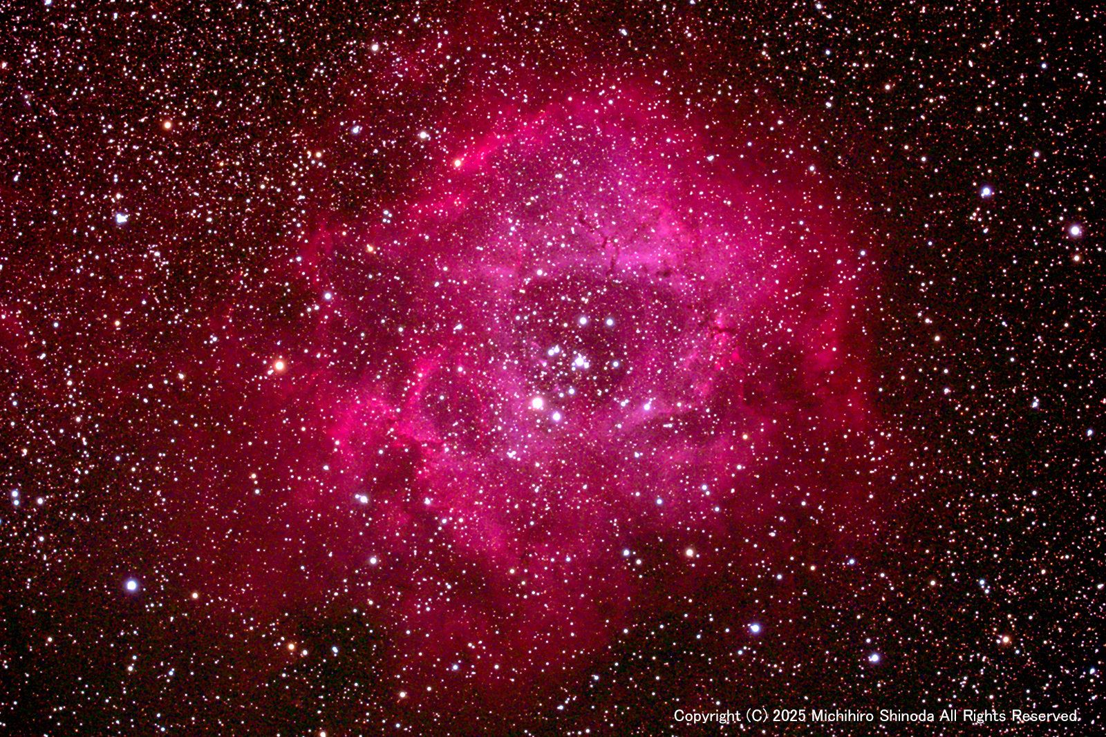 | この夜は新月期に加えて寒中。例年はとうてい星空は望めない時期だったが、SCWによるとどうやら、もうひと晩晴れるらしい 今年は立春寒波が襲来とか。せっかく覆い被さった枝を切り、落石を取り除いて走行できるようにした林道だが、しばらく入ることができなくなる 天文薄明の終了時刻を見計らって準備をしていると、いやな雪雲が北から押し寄せてきた。あれよあれよという間に雪が降り出し、あわてて鏡筒と赤道儀にタオルをかぶせて傘を差しかける スーパーコンピュータの雲量予想など当てにならないものだと、ぶつぶつ独りごちて北天を見上げていると北東方向に火球が流れた。時刻を確認すると20時18分だった。雲間から見た火球は-6等級と明るく、中速でやや赤味がかった火球だった。雪雲の隙間から見た火球は途中で2度爆発したように見えたが、これは雪雲の隙間を通して見たからそのように見えたのかもしれない 翌日、日本流星研究会、日本火球ネットワークの掲示板を見ると、愛知県から3件、静岡県、滋賀県、奈良県からそれぞれ1件ずつ報告が上がっていた。これに私の岐阜県の火球情報を加えると、冬型の気候で星空の観察が難しい日本海側を除いておおよそ中部地方で、北東から東方向に流れたことが分かる 流れることが分かっているのだったら、別のカメラをポータブル赤道儀にセットしておくのだったと、これは無理なこと 閑話休題 上の写真はいっかくじゅう座のばら星雲。オリオン座の1等星ベテルギウスからこいぬ座の1等星プロキオンまでたどると、その中間よりやや手前に位置する。赤い薔薇のロゼットのように見えることから名付けられていて、その中心には散開星団NGC2244があり、その周囲に水素原子の出すHα線が広がっていて、写真では赤く写る。この赤い薔薇は1000万年先には消滅すると言われている。本当に消滅するか確かめられないことが残念ではある ---------------------------------------------------- カメラ SONY α7M3(IR custom) 鏡 筒 SD81S(リングスペーサーに換装)、SDフラットナーHD+レデューサーHD、625mm×0.79(F7.7→6.1) 赤道儀 SXD2、ノータッチガイド ISO6400、露出時間 1260秒 (60秒×21枚、ダーク減算後加算コンポジット処理) 2025年01月28日22時00分から、揖斐谷 |