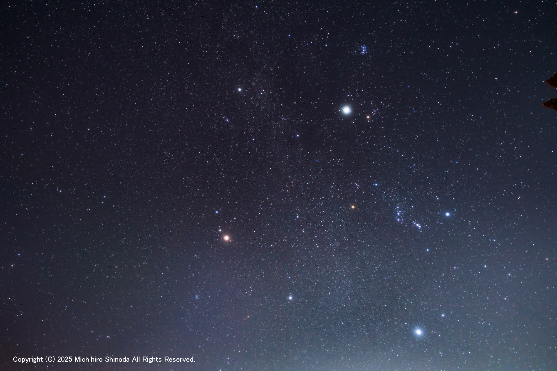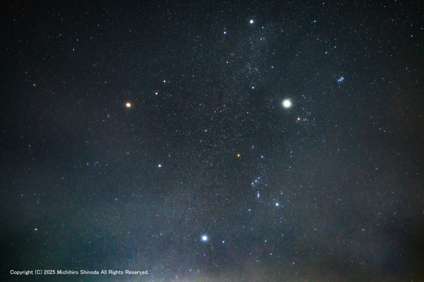 | 環境省「夜空の明るさ調査」へ提出するデータを取得した後、機材を変えて撮影 写真の右端を見ると、杉の木に近隣施設のナトリウムランプの光を受けて赤くなっている 施設照明の消灯までまだ1時間半以上ある。厳しい冷え込みに我慢できず、上の写真撮影を撮影してすぐに撤収した さあ、明日はどうか この夜空の明るさは速報値で 20.5 等級/□”(マグニチュードパー平方秒角) だった ところで上の写真にはいつものというか、この時期の冬の星空に2つの明るい輝星が加わって、実ににぎやかだ まずプレヤデス星団の下、おうし座のヒアデス星団のすぐ横に強烈な存在感を放つ星が木星。ヒアデス星団の1等星アルデバランが霞むほどの明るさだ 次に冬の天の川を左に横切るとふたご座のカストルとポルックスと並んで赤く火星が輝いている。さらに火星の左下にはかに座のプレセペ星団が顔を出している。春の星座の登場で季節が冬から春へと移ろうとしていることを知る 木星も火星も惑星なので、いつもこの位置にあるわけではない。また、もう少し早い時間には西天に金星がこれまた強烈な光を放っていることに気づく。宵の明星だ 寒いのは勘弁してほしい、というものの、夜空の星を肉眼で眺めてみることを勧めたい。便利に見えるスマホアプリだが、暗順応の進んだ肉眼には邪魔になるので、やはり眼視観察が一番だ ---------------------------------------------------- 14mm、ISO800、f2.0、30秒、マニュアルWB、LEE SP-31 ソフト №1、Raw 高感度NRはoff、長秒時NRはon、赤道儀で恒星追尾撮影、揖斐谷 SONY α7RM5 + FE 14mm F1.8 GM 2025年01月21日21時03分 |