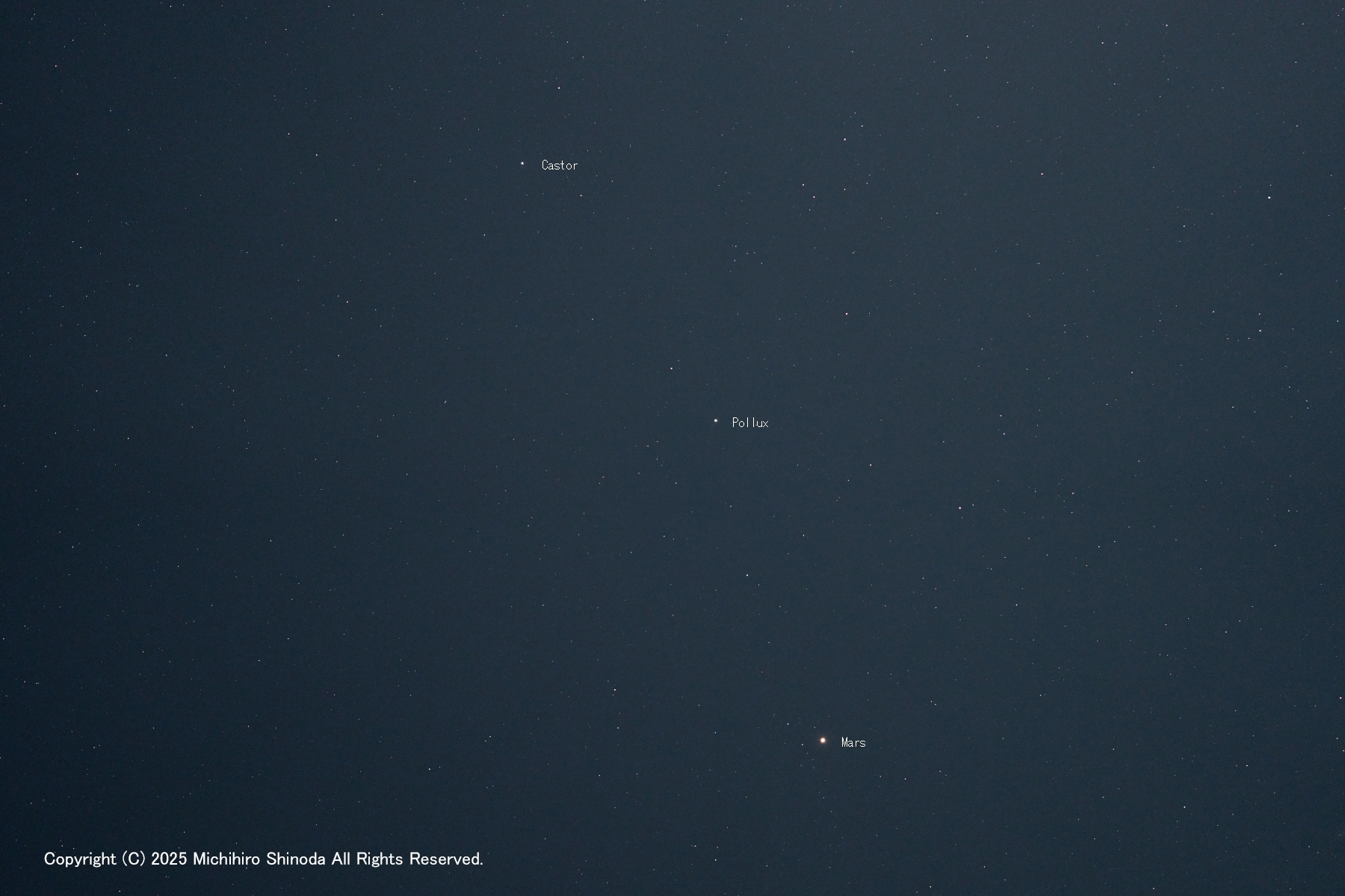 | 火星が地球と最接近 金生山明星輪寺の初虚空蔵の夜、火星が地球と最接近した 柴燈護摩供と火渡りの間は珍しく風も止んだが、ともかく寒かった 火渡り修行には400名を超す人が並び、初虚空蔵の火渡りが始まって以来の賑わいに延々と参拝者の列は続いた。エネループ・プロ8本の外部電源で増強したフラッシュのおかげで、ほぼ全員の火渡りをカメラに収めることができた。さすがに疲れた この夜は月齢12.2の月が明るく照らした また時折夜空を雲が覆った この夜、火星が地球と最接近するのは22時37分。その時刻は雲に覆われてとても星空どころではないと諦めて片付けにかかると、時間帯によっては雲の切れ間から星空が顔を出した 上の写真は、右下に-1.4等の火星が赤く輝き、その左上には1.16等のふたご座のポルックスが輝き、さらにその上にはふたご座のカストルが1.58等で輝いた。まるで三兄弟のようだった 月明かりは強烈で雲も邪魔するあいにくの条件だったが、街明かりの中ではよしとするしかない ---------------------------------------------------- 85mm、ISO800、f1.4、1秒、マニュアルWB、Raw 高感度NRはoff、長秒時NRはon、三脚で固定撮影、金生山 SONY α7RM5 + FE 85mm F1.4 GMⅡ 2025年01月12日22時39分 |