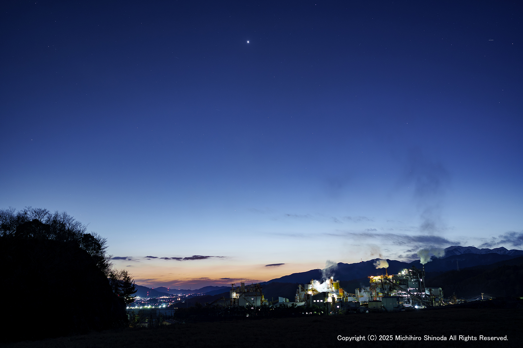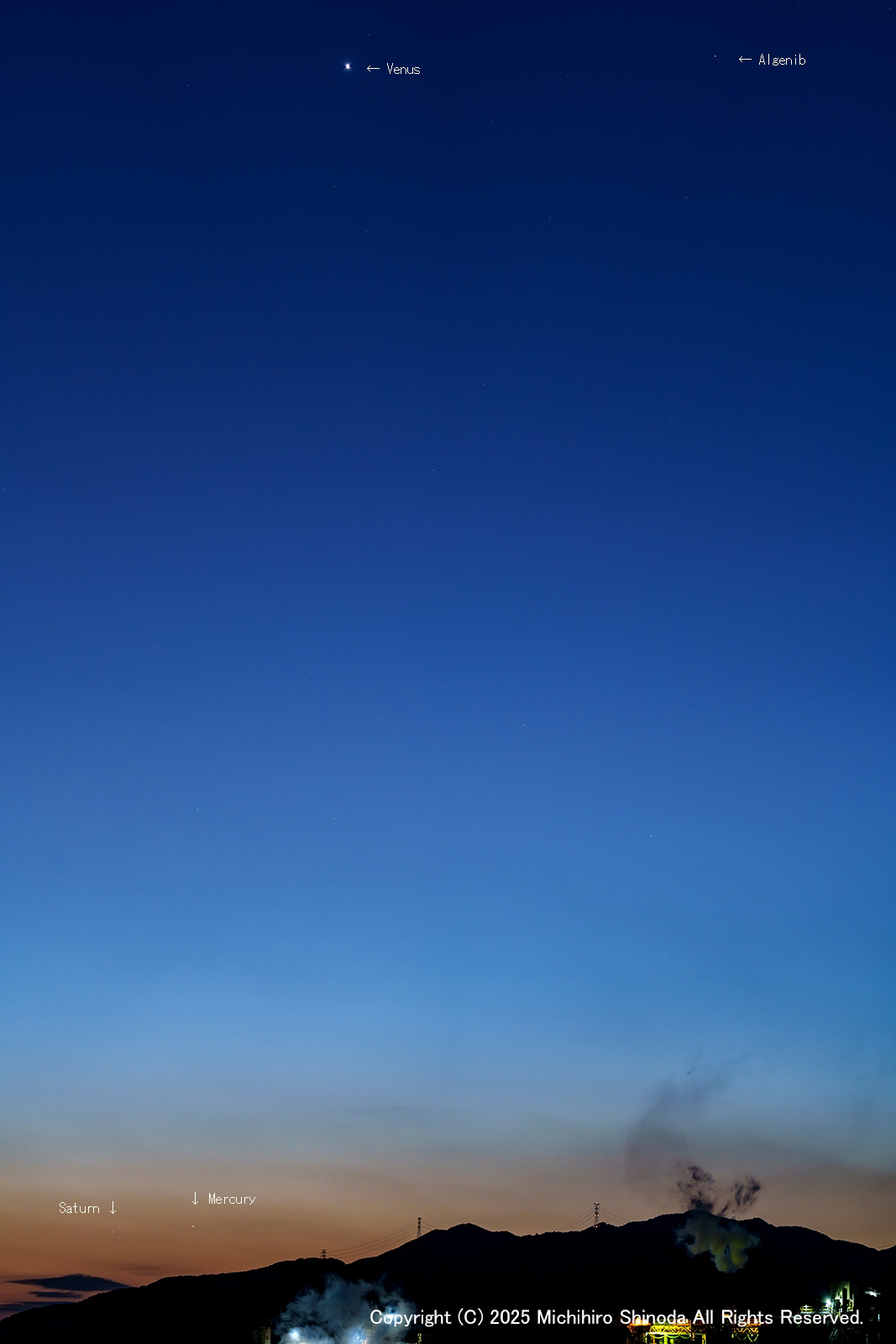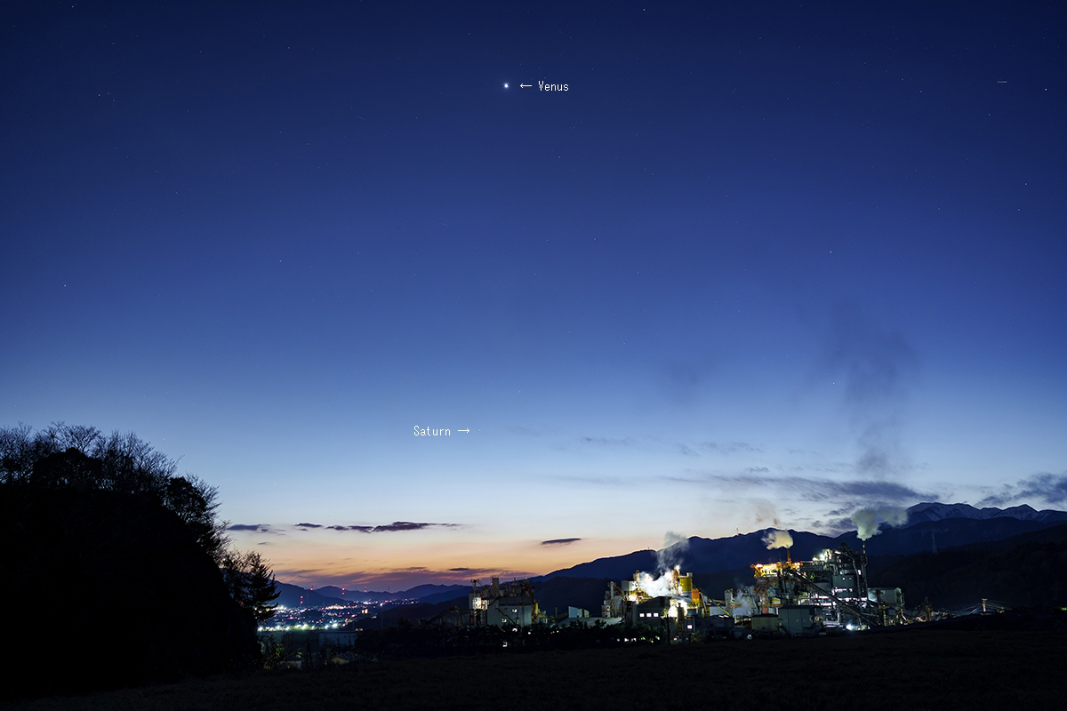 | 最大光度の金星を撮る 金生山明星輪寺の明星とは金星のことで、宵の明星(よいのみょうじょう)、暁の明星(あけのみょうじょう)として親しみを込めて崇拝されてきた。虚空蔵菩薩信仰では明星は虚空蔵菩薩の応化とされている。星祭りの対象としては宵の明星は太白星と呼ばれ、暁の明星は単に明星と呼ばれて区別されてきた 地球より内側の軌道を公転する金星は、1年7か月ごとに地球との会合を繰り返す。2025年の金星は1月10日の東方最大離角を過ぎて2月15日に最大光度となり、3月21日の内合を経て以後は明け方の空に回る。そして4月27日にふたたび最大光度を過ぎて6月1日に西方最大離角となる 昨夕は残念ながら雲に覆われたが、1日を経てこの夕は快晴の西天となった。最大光度の金星の明るさは-4.8等級で、普通の1等星と比べてもその明るさは200倍以上と際だっている。最大光度を過ぎると金星は高度を急速に下げつつ3月21日の内合へ向かう この日の金星は土星を従えて、明るく輝いていた ---------------------------------------------------- 35mm、ISO640、f1.4、1秒、マニュアルWB、Raw 高感度NRはoff、長秒時NRはon、三脚で固定撮影、金生山 SONY α7M4 + FE 35mm F1.4 GM 2025年02月16日18時26分 |