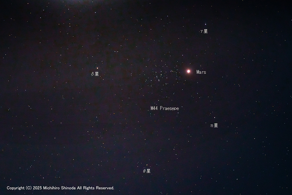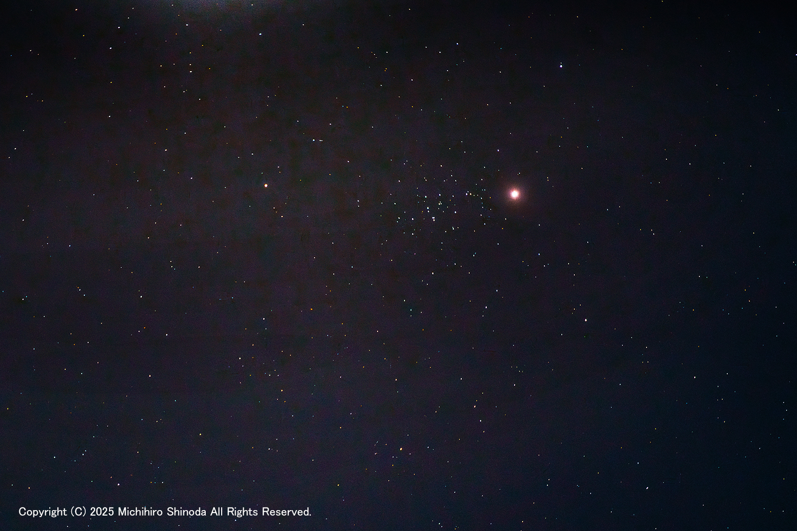 | M44 プレセペ星団 に火星が侵入 火星が かに座(Cancer)の宝石箱 とも呼ばれる 散開星団・プレセペ星団 に侵入した。かに座は2世紀の天文学者プトレマイオス(トレミー)の48星座の1つ。黄道に位置するため、たびたび惑星が接近・通過する M44プレセペ星団はかに座の甲羅部分を形成する4つの恒星(γ星、δ星、θ星、η星)の中にある。この夜は火星(Mars)がM44の中に侵入するという珍しい現象が見られた 上の写真ではプレセペ星団の左上からは強烈な上弦の月が照らしている。明晩まで待つと月は離れていくので、月明かりの影響少しずつ軽減される。ただし上弦を過ぎた月はより明るさを増す。しかも明晩は星空が期待できないという残念な予報。この夜の火星の光度は1.0等 春霞 + 街明かりの光害 + 上弦の月明かり というなかなかやっかいな夜だった このときの高度が31度もあったので、場所さえ選べば、また短時間であれば揖斐谷からも撮れたかもしれない なかなか思うようにはいかない ---------------------------------------------------- 180mm、ISO1600、f2.8、4秒、マニュアルWB、サイトロン スターエンハンサー、Raw 高感度NRはoff、長秒時NRはon、赤道儀で恒星追尾撮影、美濃平野部 SONY α7M4 + TAMRON 70-180mm F/2.8 Di III VXD 2025年05月04日22:03 |