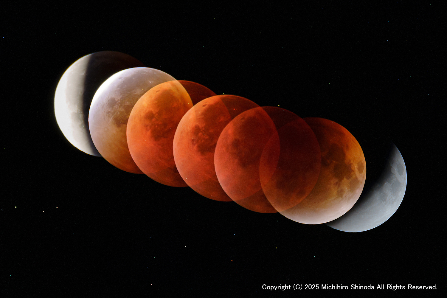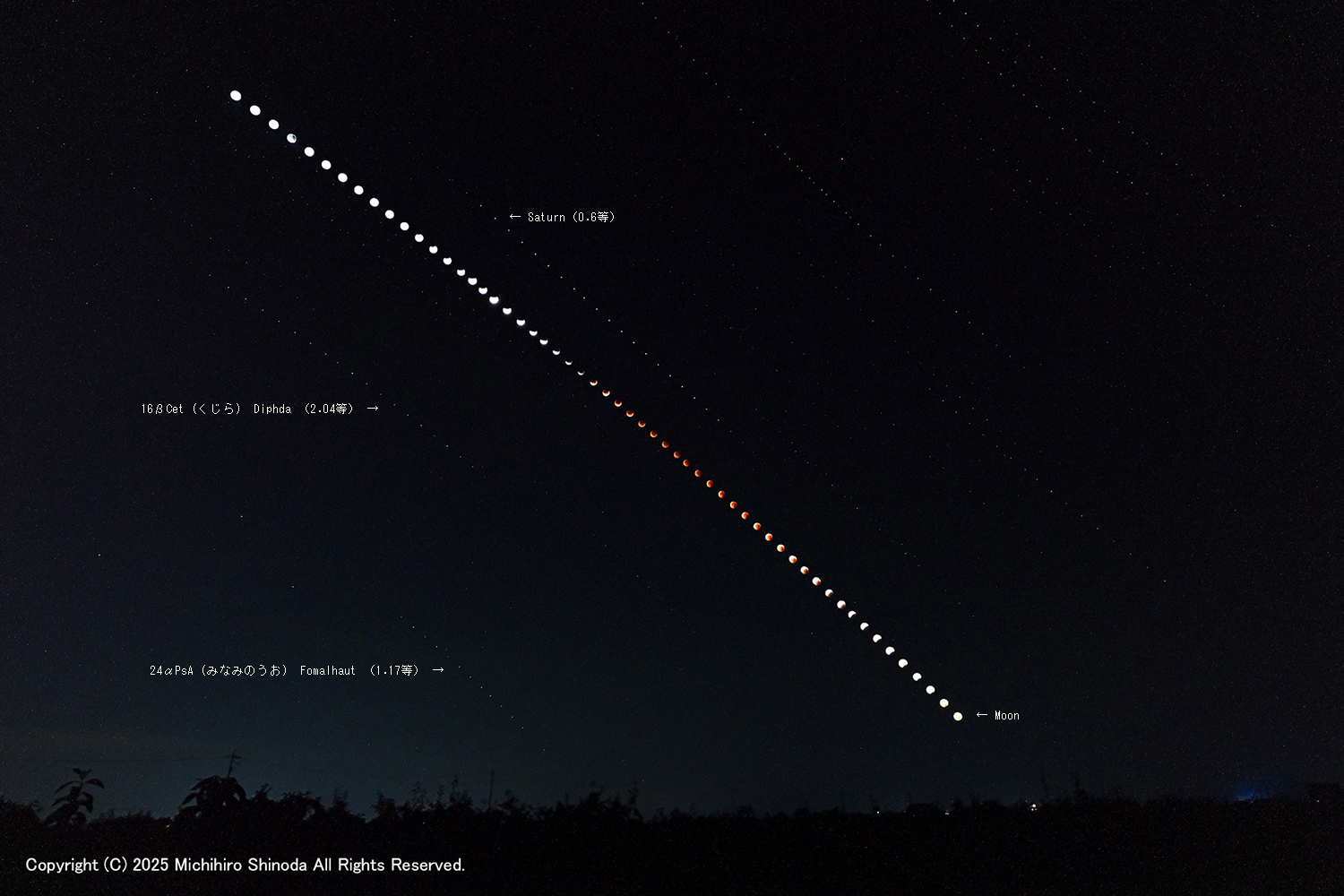 | 20250908 皆既月食 地球の影を基準にして 皆既月食のイメージを合成 15分間のインターバルで撮影した画像を、食の最大時を中心に、おおまかに地球の影を基準にしてイメージを合成 皆既状態となった瞬間に月の周囲にみずがめ座の恒星が輝きだした 今回は西天の月食で高度が低かったため、西天が広く見渡せる美濃平野部まで出て撮影した。22時過ぎの降雨の後には淀んだ空気が一掃されて、残暑の空気が少しだけ秋めいた空気へと一変した。暗いみずがめ座の恒星が一斉に輝きだしたのは、見事だった 次の皆既月食は2026年3月3日。宵の口から夜間にかけて東天の食となるので、皆既状態では月は今回よりも高度が高い 好天に恵まれることを期待したい |
