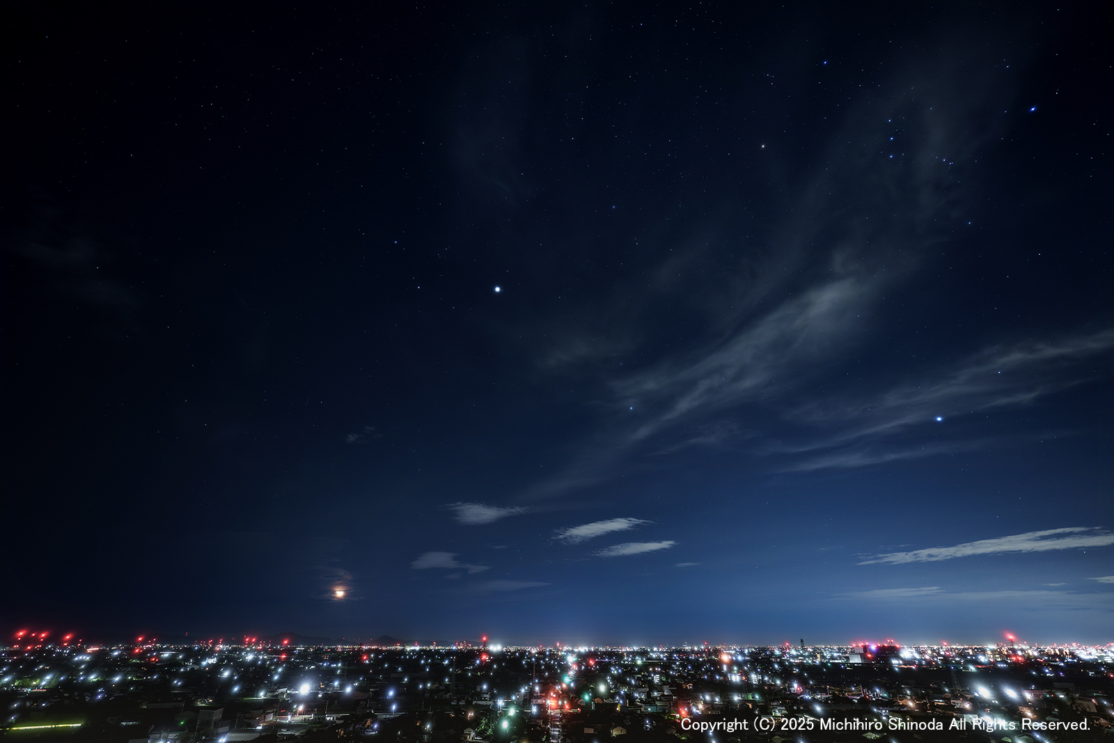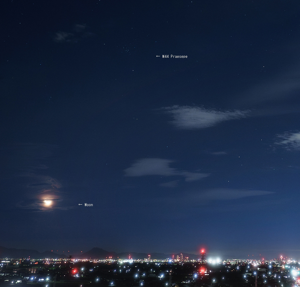 | 夜明けの M44プレセペ星団 を撮る 夜明け前の東天に、細い月と かに座の散開星団 M44プレセペ星団 を撮る 細い月といっても、雲が邪魔をして細いかどうかわからない しかも、コロナ禍が過ぎてから麓の工場は24時間のフル稼働を続けているようで、工場や運送会社の照明がまぶしい こんなに明るくてM44が見えるかどうか心配したが、撮影した写真にはしっかり写っていた 雲が邪魔をしているが、月のすぐ下には 明けの明星・金星があり、明日の朝には細い月と金星が並ぶ 残念ながら天候が悪い予想なので、明朝は期待できない せめて1日前の東天を見ておきたいと、起き出して出かけた この秋、初めて寒さを感じる朝だった 蚊除けではなく、寒さから長袖を羽織るのも初めて ところで、現在の東天は大変賑やかだ オリオン座が存在感を見せ、シリウスとプロキオンといった冬の1等星も輝いている さらに ふたご座 には木星が滞留していて、木星の明るさが目を引く。このときの木星の明るさは-3.9等 現在は木星は明け方の東の空の ふたご座 に姿を見せているが、2025年11月11日からは逆行を始め、2026年3月11日に逆行を終え、同年12月13日に再び逆行を始める。つまり2026年は2度の逆行があることになる ---------------------------------------------------- 20mm、ISO400、f2.0、4秒、マニュアルWB、サイトロン・スターエンハンサー、Raw 高感度NRはoff、長秒時NRはoff、三脚で固定撮影、金生山 SONY α7M4 + FE 20mm F1.8 G 2025年09月19日03時11分 |