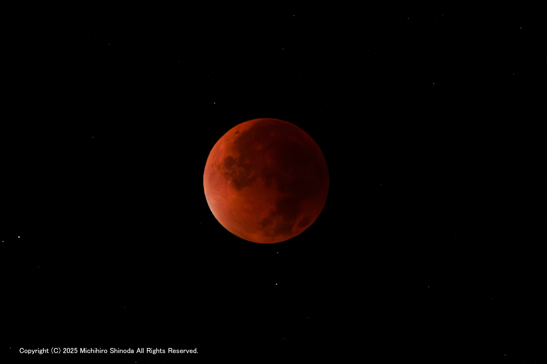 | 皆既月食 食の最大(食分 1.367) 皆既状態になると、普段は暗くて目に付きにくい みずがめ座 の恒星の数々が皆既状態の月の周りに一斉にきらめき始めた 東天を振り返ると、真夏の オリオン座 が輝いている。そのすぐ左には ふたご座 も輝いている。星の巡りは秋から冬へと移り変わりつつある 22時頃には突然の雨で赤道儀の設置を断念する。後でアメダスで確認すると時間雨量2mmだった 北の方からは雨雲が押し寄せ、どこにも北極星はない。結局朝まで稲光がずっと続き、さらに時おり雲が横切ったり、薄雲が覆うなど冷や汗ものだった。多少の降雨のおかげで少しだけながら、どんよりとした夏の空気が少し洗われた気がするので、まあよかったということにしよう 今回の皆既月食は西天で見られた。西天に山稜が邪魔をすると実質的に月入帯食となってしまう恐れがあったので、ともかく西天が地平まで開けた平野部まで下って撮影した 本影終了時は天文薄明が終わり、市民薄明(常用薄明)があと10分で始まろうとする時間帯だった 今回難しかったのは、皆既の時間帯では月の高度が低かったこと。そのため空気がよどんで靄を伴うこととなり、鮮明な月食とはなりにくかった。皆既中の月の明るさも相当暗く、暗い赤といったところで、ダンジョンのスケールで2ほどしかなかった。ターコイズフリンジも期待したほどの鮮明さでは見られなかった このあたりの問題は、次の皆既月食撮影の課題とするほかはない ところで長時間星空を眺めている時にはラジオをつけていることが多い。山中の場合は熊よけではある。深夜なのでNHKのラジオ深夜便が定番 そこで流れてくる曲が頭に残ることが多いが、この夜はなぜだか 太田裕美「九月の雨」 が夜明けまで頭の中をぐるぐると駆け巡った 「九月の雨」は1977年9月1日にリリースされている。私は卒業を半年後に控えて、卒論の最終段階で四苦八苦していた。大学4年の秋だった あれから時は流れたが、歳だけ重ねた自分の成長を問われると、面はゆい ---------------------------------------------------- SONY α7RM5 + FE 100-400mm F4.5-5.6 GM OSS 2025年09月08日03時12分 |