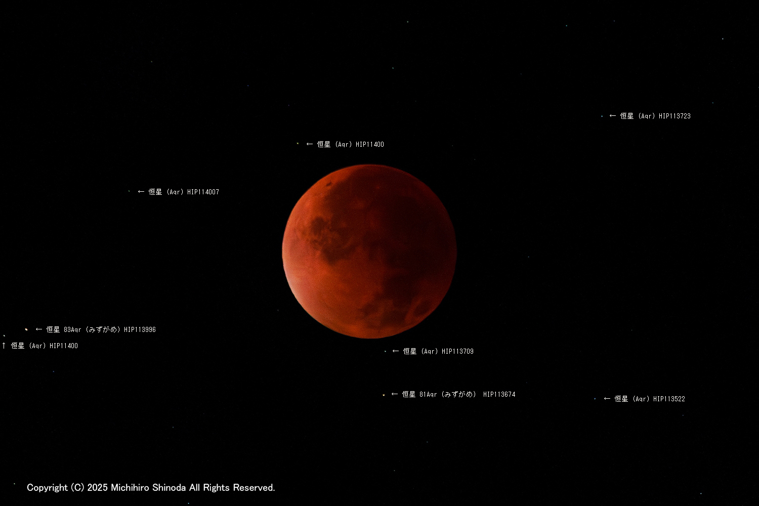 | 皆既状態の月 と 周りできらめく みずがめ座 の星々 みずがめ座はラテン語では Aquarius 。プトレマイオス(トレミー)の48星座の1つで、現代の88星座の1つでもある。また黄道12星座の1つであることから、星占いなどで馴染みが深い 上の星図の Aqr はみずがめ座 をさす 2等星以上の明るい星が1つもない暗い星座なので、月が出ていたら存在にも気づかないと思われる 皆既月食ならではの暗い星空が、みずがめ座の星々のきらめきを見せた 恒星 81Aqr (みずがめ) HIP113674 が 6.23等 恒星 83Aqr (みずがめ) HIP113996 が 5.44等 上の写野に見る恒星の中では明るい方である 皆既中に流星が流れないか期待して星空を見上げ続けたが、そう上手くはいかなかった |