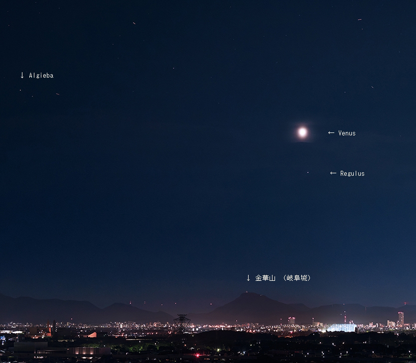 | 夜明け前の東天に しし座のレグルスとアルギエバ を撮る 金華山がシルエットを描く夜明け前の東天 この日の天文薄明は04時13分。あと15分ほどで明るくなる 等倍で見ると山頂の復興天守もわかる 金星は しし座 の1等星Regulus(レグルス)に接近している。本当は明朝であれば、2星が並んだはず。天候ばかりはどうしようもない この日の金星は-3.9等と薄雲にもかかわらず際だった明るさを見せている しし座 のγ星は連星の Algieba(アルギエバ)。2.01等と2等星ながら明るさを誇っている。しし座 にあり、草刈り鎌に似ていることから西洋では ししの大鎌 と呼ばれてきた。 しし座 の和名について野尻抱影氏は次のような話を紹介している といかけぼし(樋掛け星) しし座 ・・・・(前略)・・・・ (しし座は)名に負う春の大星座で、αのレーグルスは黄道上に位置して白光を放つ一等星、西洋では航海をつかさどる四王星の随一になっていた。従って当然、日本でも役星・当て星の一つであるはずで、必ず然るべき永あるに違いないと、わたしは機会のあるごとに探索してみたが、さらに得るしころはなかった。 戦争の末期に海軍の航空隊から人が来て、兵用に星の和名をつけてもらいたいと依頼された時にも、この一等星には困った。 ・・・・(中略)・・・・ すると、昭和二十六年に岐阜県揖斐郡谷汲の香田まゆみ君が、星の和名を小学生の家庭について調査した結果、しし座の西半部、英語で the Sickle (草刈鎌)という半円に柄が直立している形を、トイカケボシ(樋掛け星)とよんでいることを発見して再三確かめた上で報せてきた。つまり雨ドイをかける金具の形と見たのである。 ・・・・(後略)・・・・ (野尻抱影『日本の星 星の方言集』1957年) ここに香田まゆみ氏と紹介されているのは、理科教員だった香田寿男氏のこと。高浜虚子を意識して「きょし」「虚矢」に対して「まゆみ」「真弓」を筆名としていた。以前、私のページ中で20代の頃に植物学の大家でもあった香田寿男先生の講演を聴いたことを紹介した。香田先生は旧徳山村をはじめとする揖斐谷の植物相の調査研究にも大きな足跡を残している ちなみに野尻抱影氏の弟が大佛次郎氏。講演などで野尻抱影氏を紹介するときに「大佛次郎さんの兄さんです」と紹介されるのが大嫌いだったという。戦後に長野県での講演会に招かれた際に県の教育長がこのように紹介する抱影氏は真っ赤になって「ちがう、ちがう、大佛次郎は私の末弟です」と激しく注意したという逸話が残っている(石田五郎『星の文人 野尻抱影伝』1989年)。野尻家の「家長」であるという誇りを持ち続けていたということなのだろう 以下は余談に過ぎるが、大佛次郎のノンフィクション作品『パリ燃ゆ』を読了した。労働者の政府パリ・コミューンの成立と血の弾圧までを描いている。叙情詩のような大作である 長編に気後れして、これまで読んでこなかったことに忸怩たるものがある ---------------------------------------------------- 85mm、ISO800、f1.4、1/2秒、マニュアルWB、Raw 高感度NRはoff、長秒時NRはoff、三脚で固定撮影、金生山 SONY α7RM5 + FE 85mm F1.4 GM2 2025年09月19日03時57分 |
