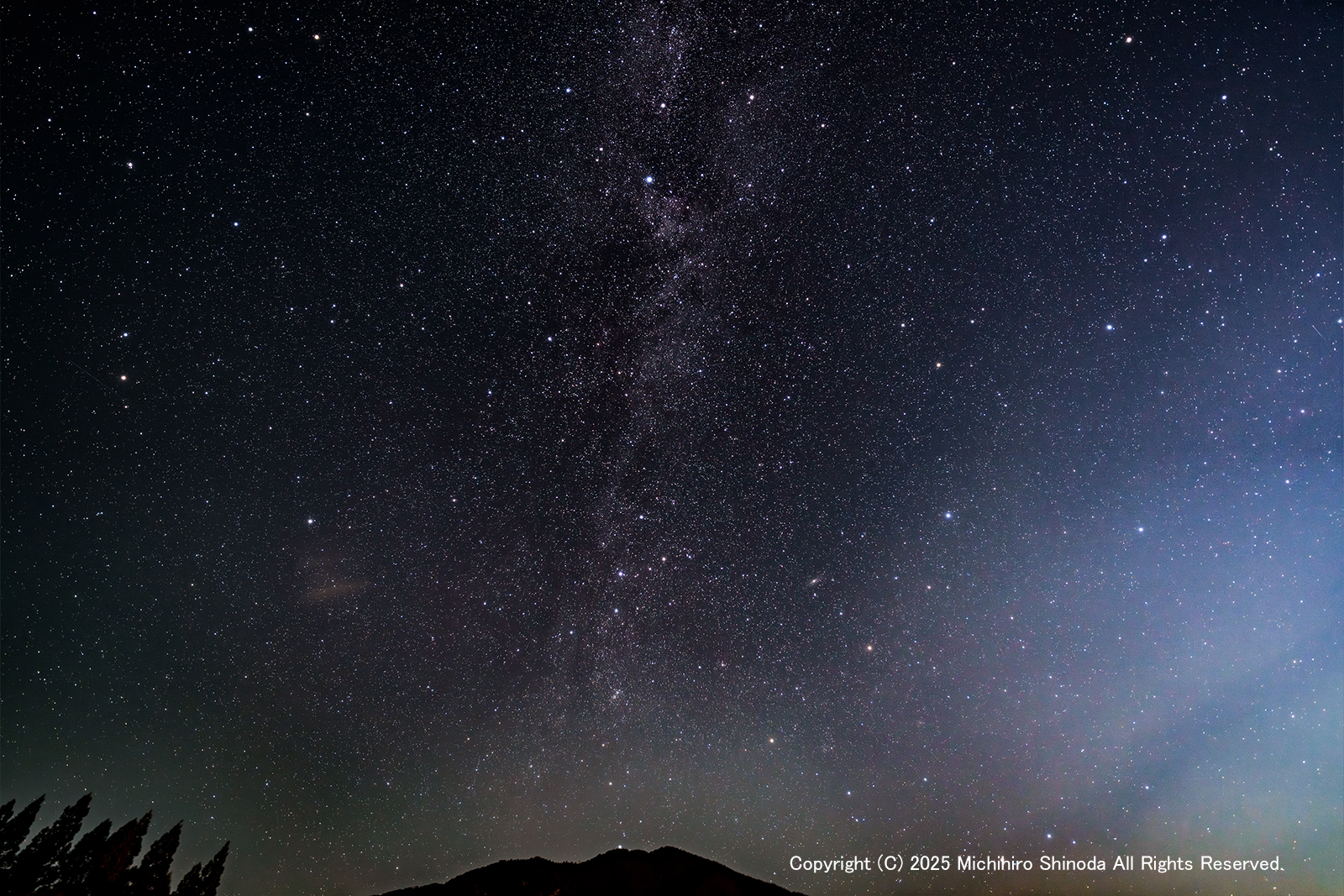 | 終わらぬ夏 彼岸も過ぎたというのに、日中の気温は33℃と信じられない暑さ 夜空も、淀んだ夏の空気に覆われている この日の月没は19時41分、天文薄明は19時09分 本当なら澄んだ秋の空気が感じられるはずが、このところ湿度も高く、夜になると雲が覆う あと数回は未明のレモン彗星が撮影できると期待しているが、何とも見通しが、、、、 このまま夏の空気に覆われ、曇り空が続くとしたら、、、、、再会できるのは、10月半ばの夕方の西天ということにもなりかねない さあ、はたしてどうなるか ---------------------------------------------------- 14mm、ISO400、f2.0、40秒、マニュアルWB、LEE SP-31 ソフト №1、Raw 高感度NRはoff、長秒時NRはoff、赤道儀で恒星追尾撮影、揖斐谷 SONY α7RM5 + FE 14mm F1.8 GM 2025年09月26日19時43分 |