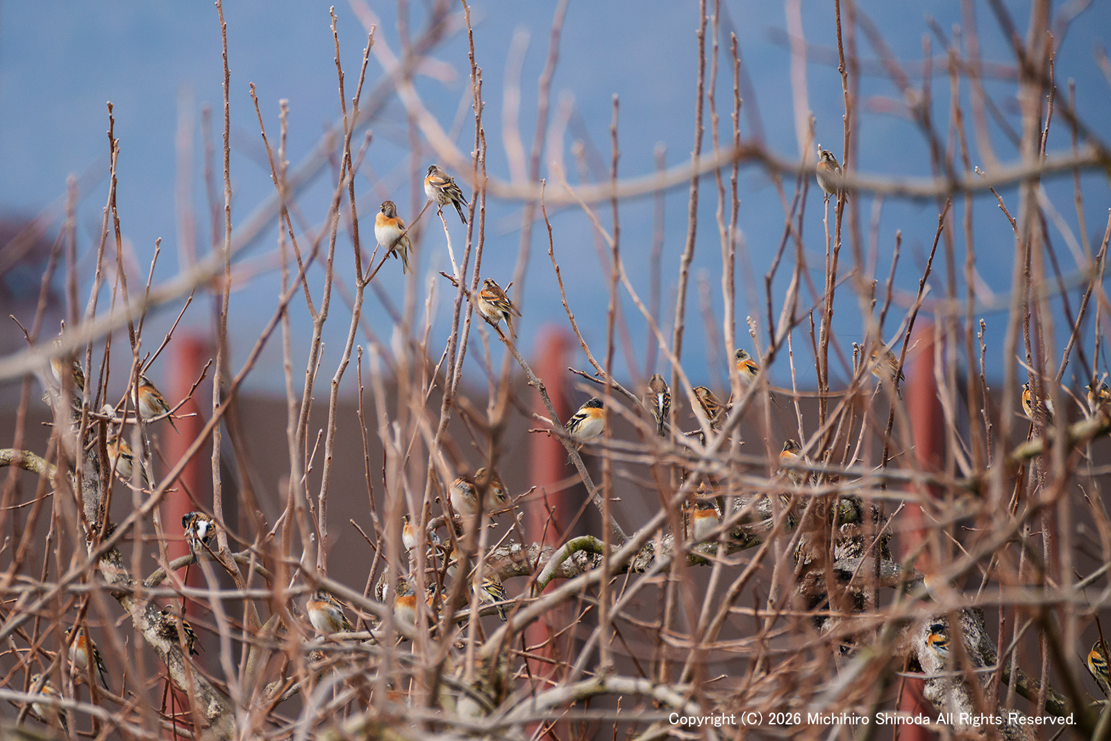 | アトリはカムチャツカなど、ヨーロッパ・アジア大陸の北部の森林地帯で繁殖する。冬は南へ渡り、日本では冬鳥として見られる。枯れ枝にアトリの群れが止まった様子は、まるで花が咲いたようだ 渡来する数は年によって異なるらしい。毎年厳密なカウントを行っているわけではないが、今年のような大群でやってくることは珍しい。昨年もこの場所でアトリを撮ったが、これほどの群れは見なかった まだ2月の初旬。もうしばらく見られることだろう ---------------------------------------------------- ■ アトリ (花鶏、冬鳥) -美濃平野部- ※ α7RM5 + FE 100-400mm F4.5-5.6 GM OSS + 14TC 2026年02月 |