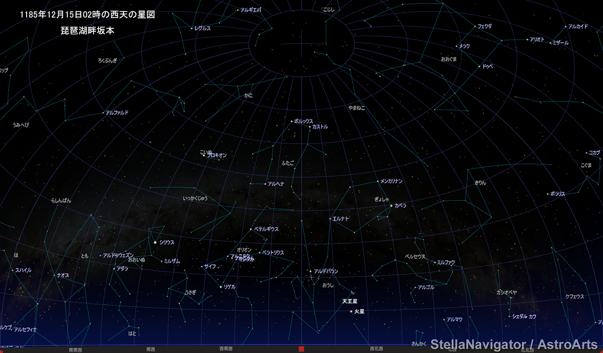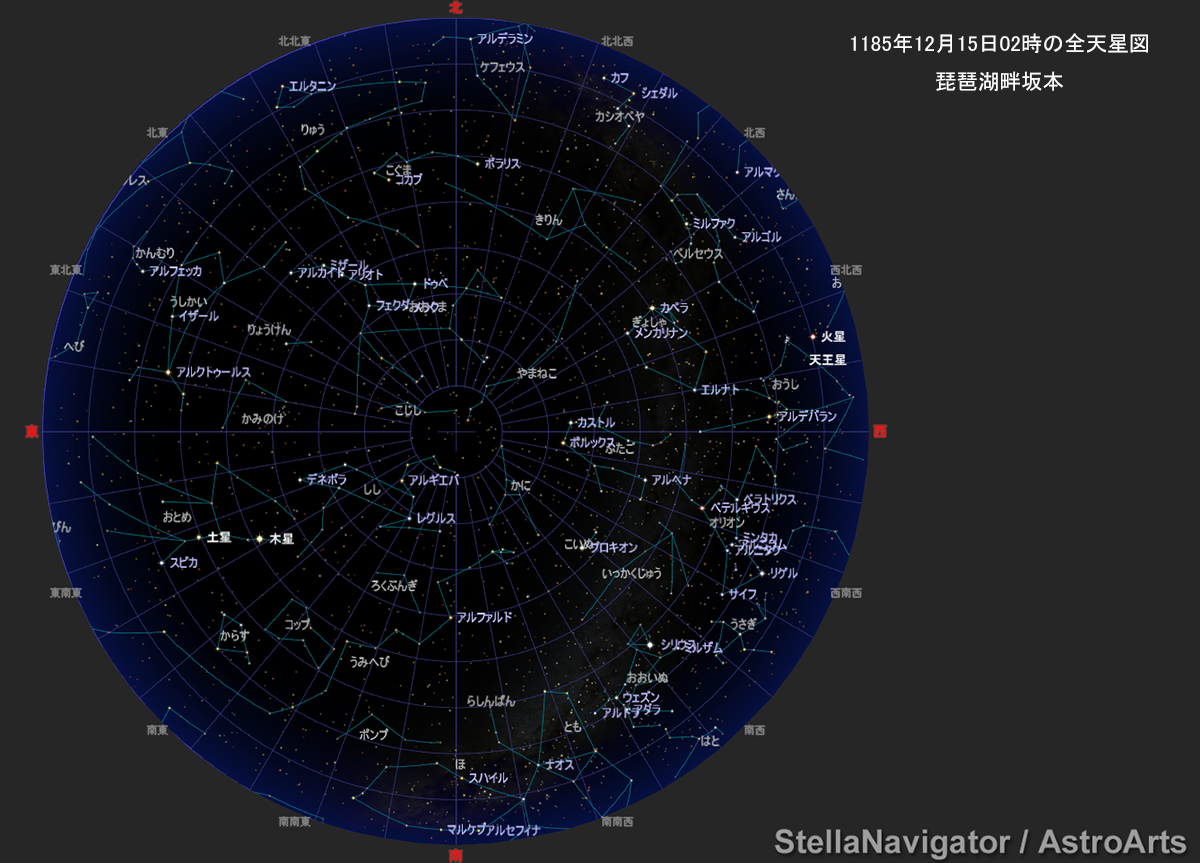 ち最後まで残るふたご座のカストルとポルックスは65度付近に見られるが、これらもやがて比叡山へと傾こうとしている。 天頂近くには春の星座のしし座とかに座がある。北斗七星から春の大曲線をたどると、うしかい座の1等星アルクトールスと、おとめ座のスピカが見える。ベテルギウス、リゲル、プロキオンがつくる冬の大三角のうちリゲルは比叡の山に隠れていたことだろう。 代わって春の大三角のアルクトールス、デネボラ、スピカが日が東の空から天頂に近づいている。冬の賑やかな星座から季節は春へと変わり始めている。 この星空を眺めた右京大夫は「光ことごとしき星の大きなるがむらもなく出でたる」とした。 そこにある、「星の大きなる」とは何だろうか。文治元年12月に客星(ふだん見慣れない星、超新星・新星・彗星など)が現れていたのだろうか。 ○ 歌人の藤原定家(応保2(1162)年-仁治2(1241)年)は摂政九条兼実の九条家へ家司として出仕し、九条兼実の連歌の席に出席するなど兼実の庇護を受けていた。その定家が残した日記が『明月記』である。『明月記』には治承4(1180)年から嘉禎元(1235)年までの56年間の記録が記されているが、そこにはさまざまな天文・天体現象の記録もある。これは天変は不吉な前触れであるとして関心が高かったからである。 かに星雲が生まれた超新星爆発(SN1054)は1054年7月4日(ユリウス暦)に世界中で観察されている。『明月記』にある記述が有名だが、藤原定家が生まれる前のことで陰陽師の記録が日記に残された。この外『明月記』には寛弘3年4月2日(ユリウス暦で1006年5月1日)、天喜2年(ユリウス暦1054年)、治承5年6月25日(ユリウス暦1181年8月7日)の超新星爆発の記録があるが、文治元年12月に客星が現れた記載はない。つまり、右京大夫が「光ことごとしき星の大きなるがむらもなく出でたる」のは客星とは考えにくい。 再現星図をよく見ると、1185年12月2日02時の東天には春の大三角に割って入るように、木星と土星がある。西には火星もあるが、高度は10度を切っていて坂本からは見られなかったはず。 StellaNavigator11 のシミュレーションによると、この時の木星の光度は -2.2等級、土星は 0.8等級。木星の出は22時24分、没は11時03分。土星の出は23時25分、没は11時40分。この時の春の大三角を構成するアルクトールスの光度は -0.05等級、デネボラは 2.14等級、スピカは -0.98等級であり、木星の明るさが際立っていた。しかも木星の高度は40度を超していて、そのすぐ下には高度30度付近に土星があった。ちなみのこの日の月齢は1.3だった。 右京大夫は雲が晴れた深夜2時、冬の賑やかな星座が西の比叡の山へ沈み始めた頃、東南の空にひときわ明るい木星とそれに続く土星を仰ぎ見た。冬の星たちが密集して輝くのに対して春の星たちが控えめに光る中、この2つの惑星は「光ことごとしき星の大きなるがむらもなく出でたる」というように、見る彼女の胸に迫ったことだろう。 彼女は12月2日未明に星空を見た、それ以前にも空を仰いだかもしれない。しかし『玉葉』に記載されているように11月28日から「陰晴不定」の日が続いていた。きっと夜空に星を眺めることは叶わなかっただろう。また12月に入っても10日までの10日間に「天晴」は4日しかなく、不安定な天候が続いた。右京大夫にとってあの夜こそが唯一の星空だったのかもしれない。 西の比叡の山に沈みゆく冬の星たち。その向こうには西海に滅亡した平氏と、壇ノ浦に自害した平資盛があった。 彼女は琵琶湖畔から仰ぎ見た星に何を見たのだろうか。 (20220217掲載) ( 続く ) |