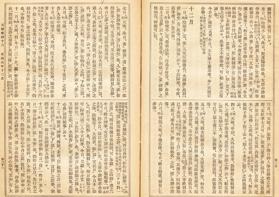 | ○ 建礼門院右京大夫が仰ぎ見た星空 右京大夫は文治元年12月1日の深夜丑二つ頃、すなわち西暦(太陽暦)1185年12月25日深夜02時頃に琵琶湖畔の坂本付近で星空を仰ぎ見た。そこで彼女が仰ぎ見た星空とはどのようなものだったのだろうか。 彼女はこの夜のことを「夜に入りて雨とも雪ともなく打散りて村雲さわがしく一つに曇りはてぬものから、むらむら星うちきえしたり。」と題詞に表現し、夜に入って雨に雪が交じる不安定な天候だったことをうかがわせる。そして、「ひきかづき臥したるきぬを、更けぬる程、丑二つばかりなどにやと思う程に、ひきのけて空を見上げたれば、殊に霽(は)れて、、、」深夜に星空と出会い、その美しさを讃美している。 この時の天候を知る手がかりに、九条兼実(藤原兼実、久安5(1149)年-承元元(1207)年)の日記『玉葉』がある。 九条兼実は藤原北家・関白藤原忠通の六男として生まれ、従一位摂政・関白・太政大臣を歴任し、朝廷の中枢を担った人物である。『玉葉』は彼の長寛2(1164)年から正治2(1200)年までのおよそ40年間にわたって書き綴った公私にわたる日記である。 『玉葉』は国書刊行会から九条家旧蔵本を底本として3巻が発行されている(1906~1907年)。下図はそのうち第三巻の文治元年12月の冒頭部分である(「国立国会図書館デジタルコレクション」より引用)。 |