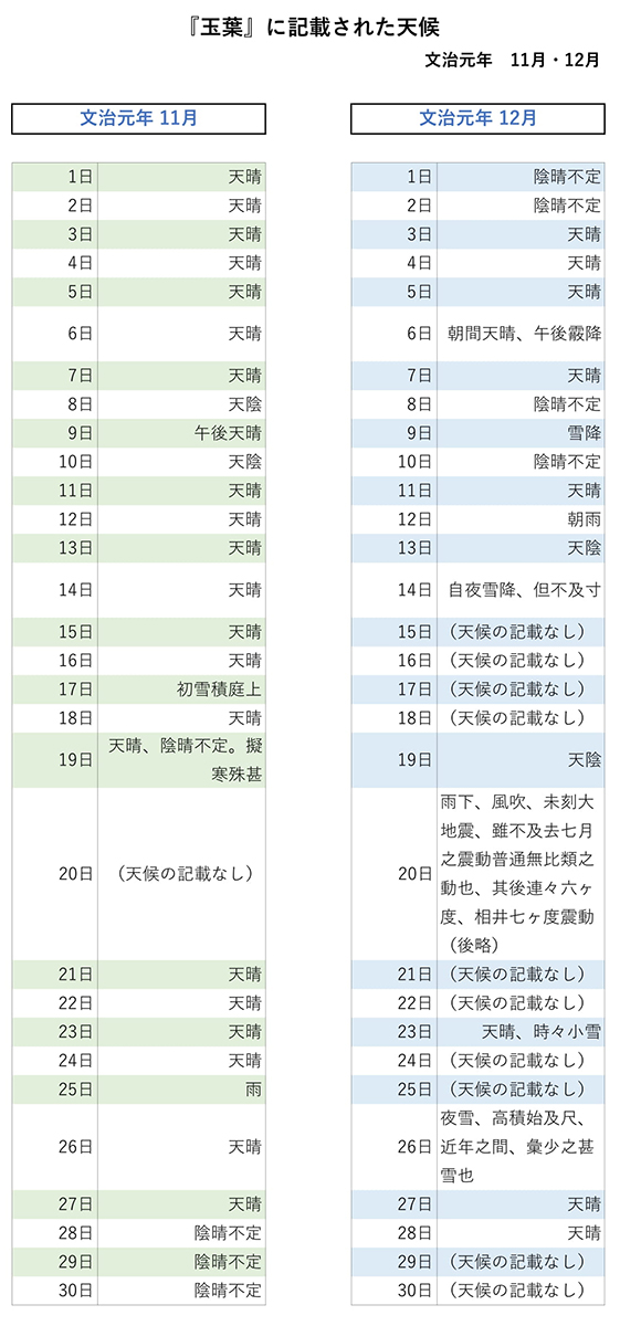 | 『玉葉』は日付、干支、天候、日記の順に書かれていて、ここで注目したいのは日付と天候である。 上図から12月1日、2日と「陰晴不定」と続き、3日になってようやく「天晴」とある。 文治元年11月と12月の『玉葉』から抜き出した天候は下図の通りである(暦はすべて旧暦の宣明暦)。 11月28日から12月2日まで5日間連続して「陰晴不定」が続いている。ちなみに11月は「天晴」が22日あり比較的天候が落ち着いていたことがうかがわれるが、12月の「天晴」は9日にどとまっている。ちなみにこの年の初雪は11月17日(太陽暦では12月10日)で「初雪積庭上」とある。 |